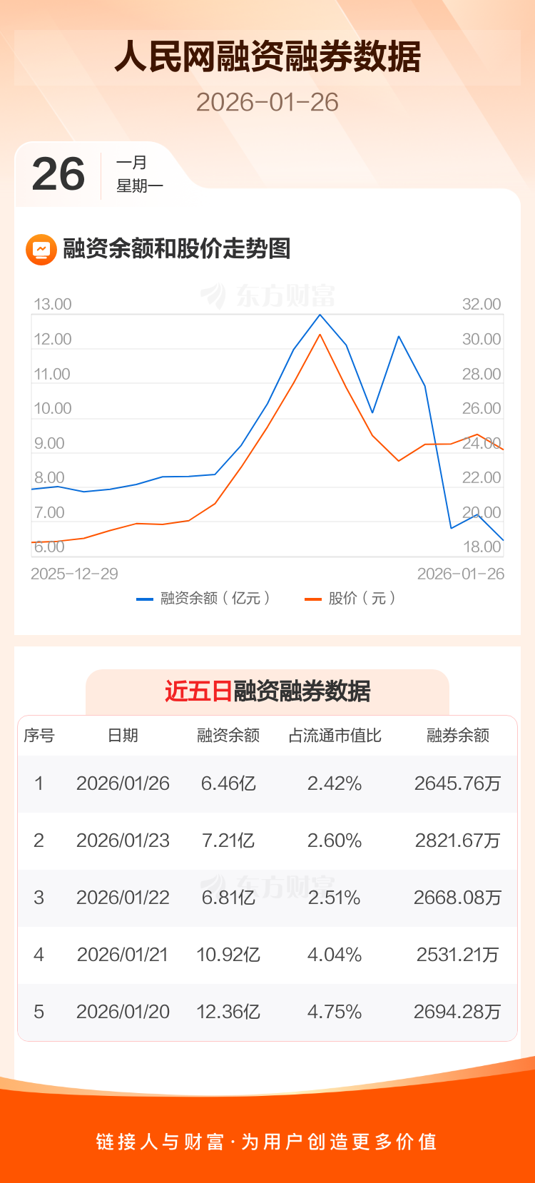 交易所最新数据显示,人民网于2026年1月26日获融资买入1.48亿元,融资偿还2.22亿元,当日融资净偿还7448.33万元。目前,该股融资余额6.46亿,占流通市值比例为2.42%。