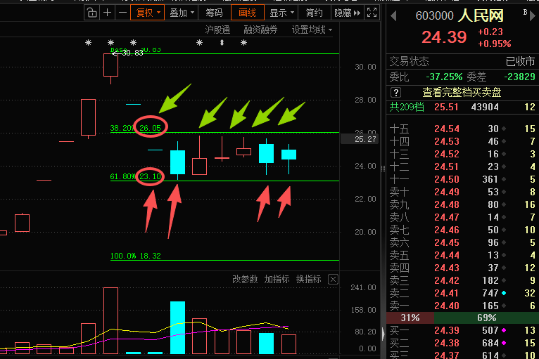 市场上很多人每天都在说高抛低吸,低吸高抛。说起来容易,做的时间又做不好。不过对于老股民的我来说确实轻而易举,先找到股票走势规律,然后找到合适正确的方法,在支撑低吸,在压力高抛。比如下方图,就可以在26.05左右高抛,在23.10左右低吸。怎么样。满意吗?学到了吗?你的点赞和评论顶帖,会为你下次知识获取增加实效!!