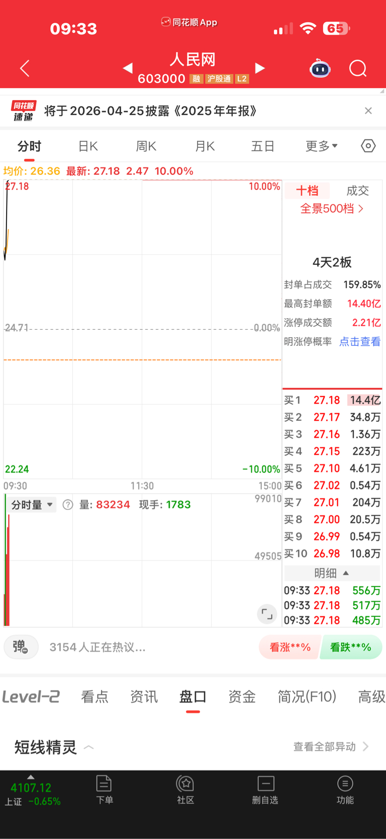 $人民网(SH603000)$ 新年最后一天最美好的时光!!!14.4亿直接焊死涨停板