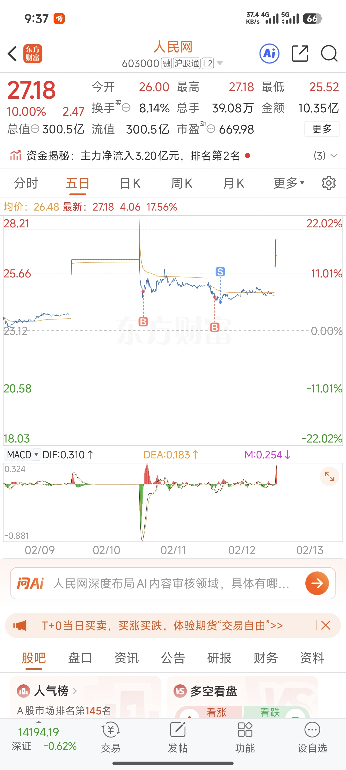 $人民网(SH603000)$ 昨天被吓跑了大部分,只留下了点低仓,唉,自己还是经验不足,
