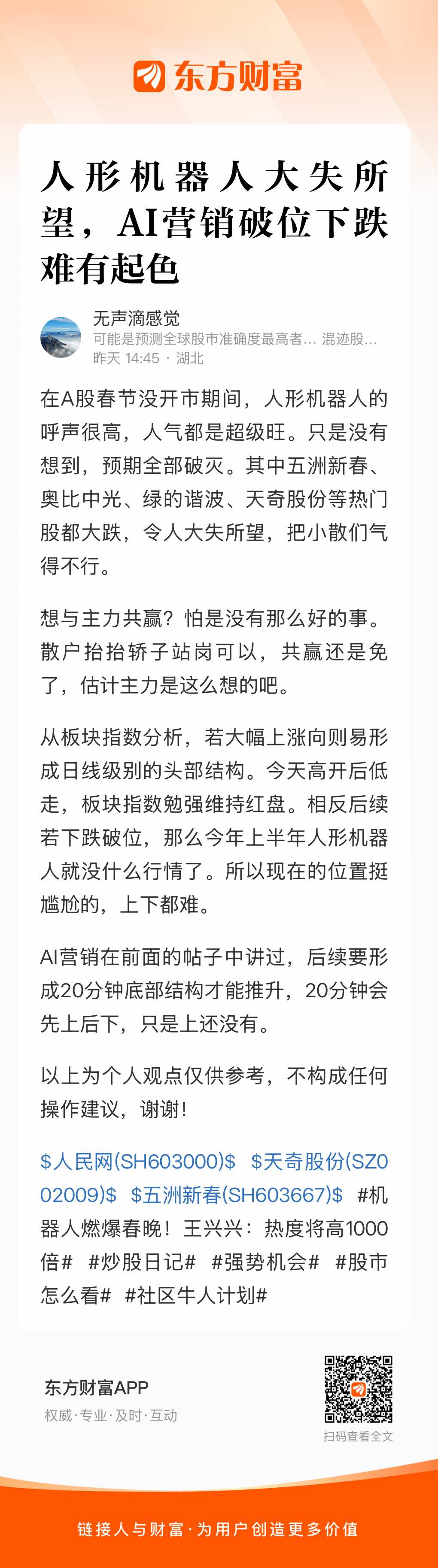$人民网(SH603000)$ $天奇股份(SZ002009)$ $五洲新春(SH603667)$ #机器人燃爆春晚!王兴兴:热度将高1000倍# #炒股日记# #强势机会# #股市怎么看# #社区牛人计划#
