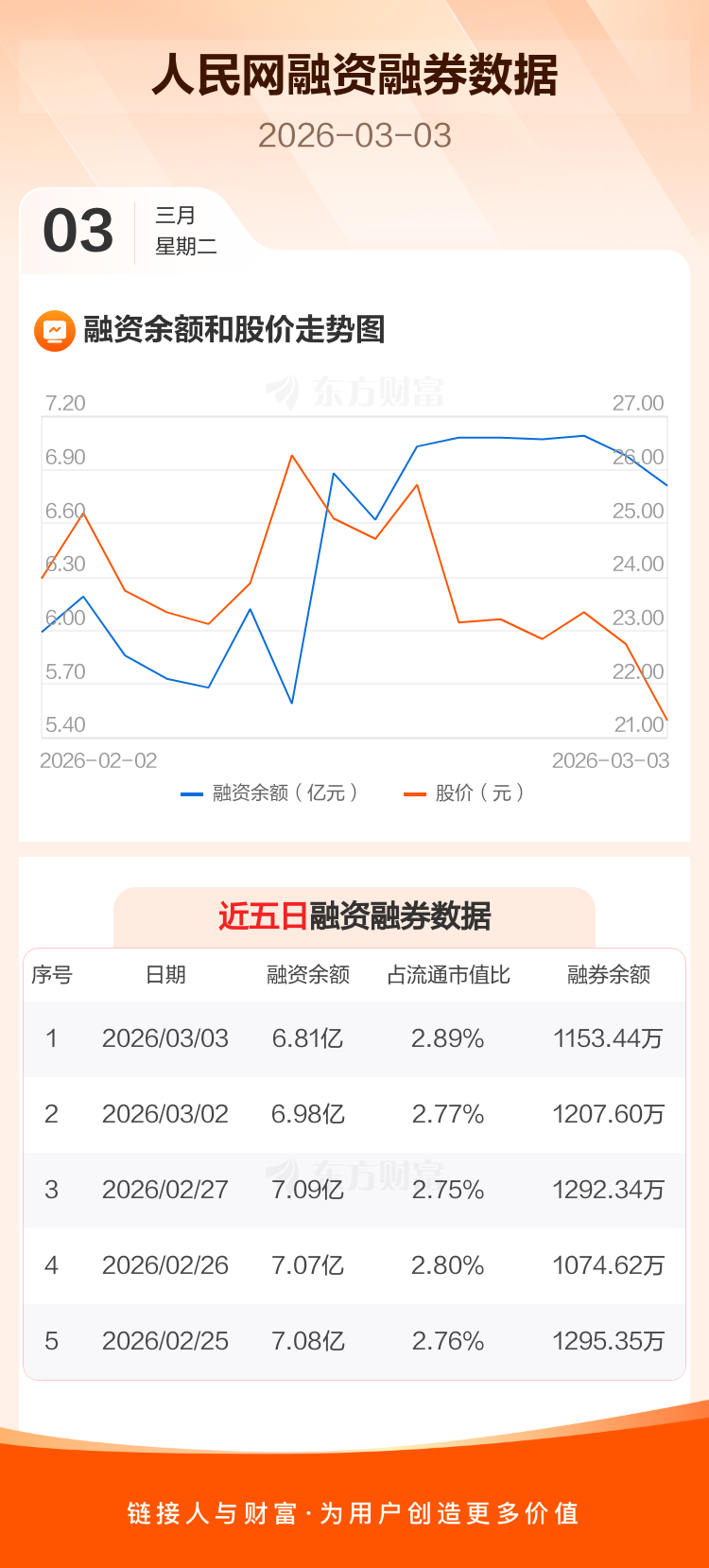 交易所最新数据显示,人民网于2026年3月3日获融资买入8830.75万元,融资偿还1.05亿元,当日融资净偿还1718.83万元。目前,该股融资余额6.81亿,占流通市值比例为2.89%。