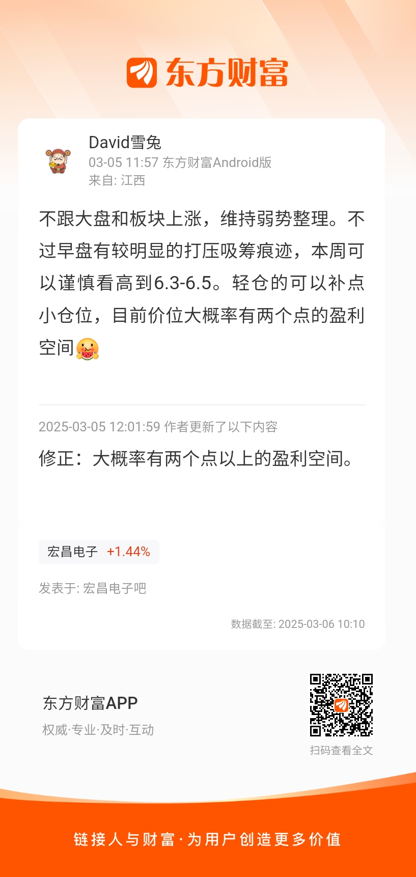不跟大盘和板块上涨,维持弱势整理。不过早盘有较明显的打压吸筹痕迹,本周可以谨慎看高到6.3-6.5。轻仓的可以补点小仓位,目前价位大概率有两个点的盈利空间