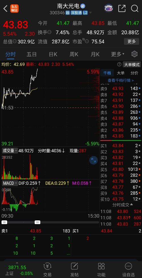 //@David雪兔 :今天南大光电最低价40.5,我的挂单40.51已成交。盘中走势看,已站稳42元,明天可继续持股待涨。宏昌硬不过一天,今天又回到了死猪走势