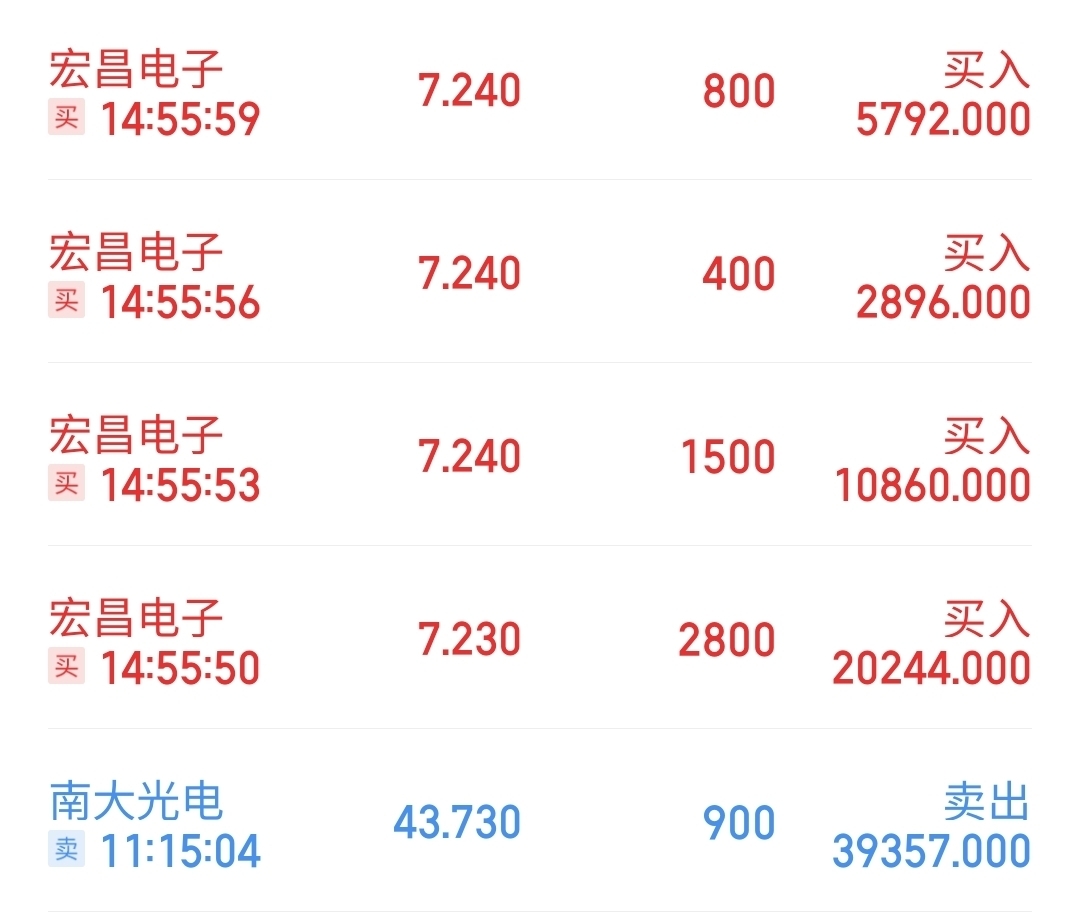 $宏昌电子(SH603002)$ 今天盘中南大光电逢高止盈卖出,尾盘逆市买进宏昌,计划下周在7.5附近卖出。在外面打个野再回到宏昌,宏昌的主力下周会让我赚钱吗?