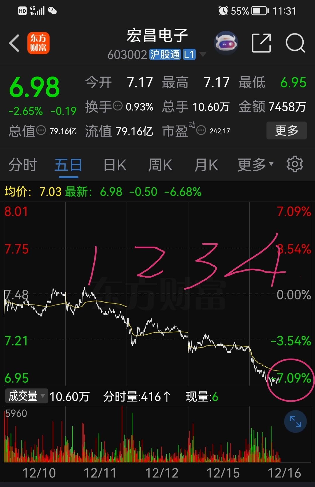 $宏昌电子(SH603002)$ 今天估计最后一跌,尾盘抢筹码扫地摊货!