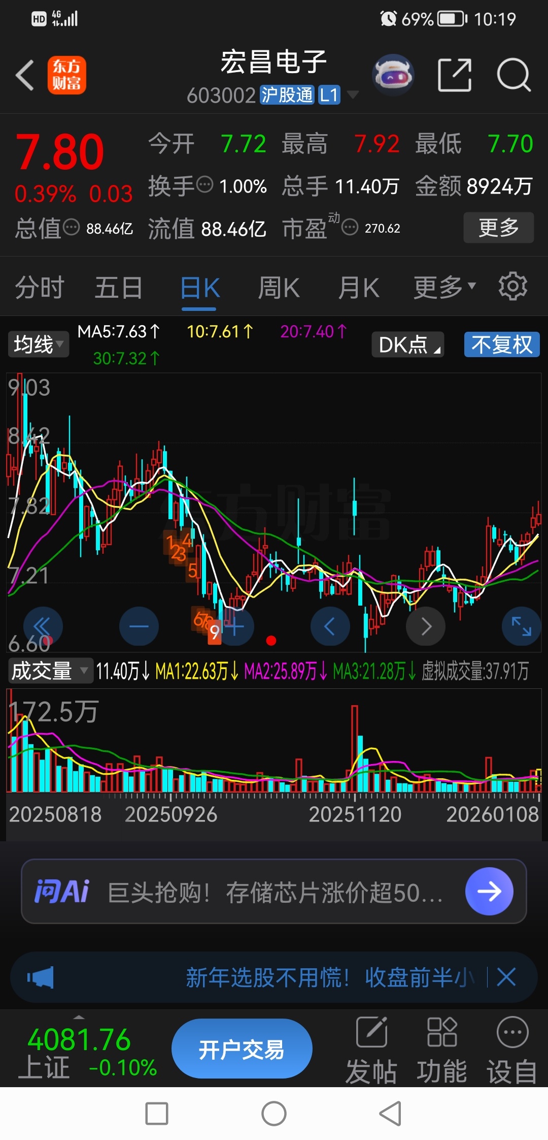$宏昌电子(SH603002)$ 在相对低价位还没有起动的个股,牛市里最聪明的选择:是逢低布局买买买,把手上的资金换成筹码,而不是逢低卖出筹码变现。