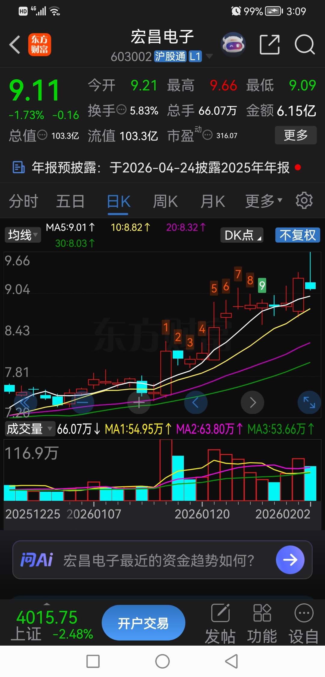 收盘了,大A市场和早上开盘前预测的结果着不多。宏昌电子的确是受大盘指数影响,缩量回落到911处。