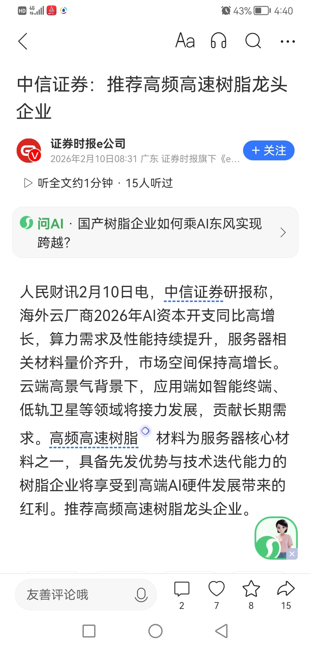 人民财讯2月10日电,中信证券研报称,海外云厂商2026年AI资本开支同比高增长,算力需求及性能持续提升,服务器相关材料量价齐升,市场空间保持高增长。云端高景气背景下,应用端如智能终端、低轨卫星等领域将接力发展,贡献长期需求。高频高速树脂材料为服务器核心材料之一,具备先发优势与技术迭代能力的树脂企业将享受到高端AI硬件发展带来的红利。推荐高频高速树脂龙头企业。