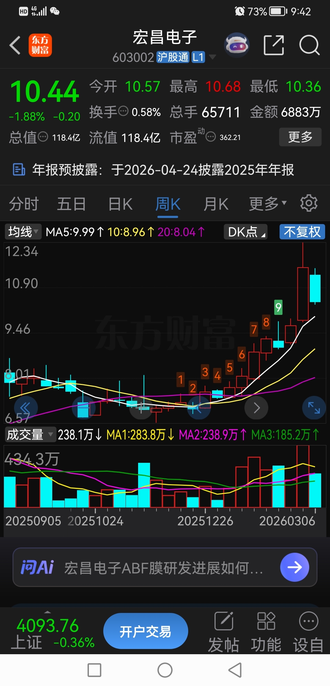 $宏昌电子(SH603002)$ 宏昌连续几天的回调,已经是周级别的中级别调整,估计破十是极有可能的。