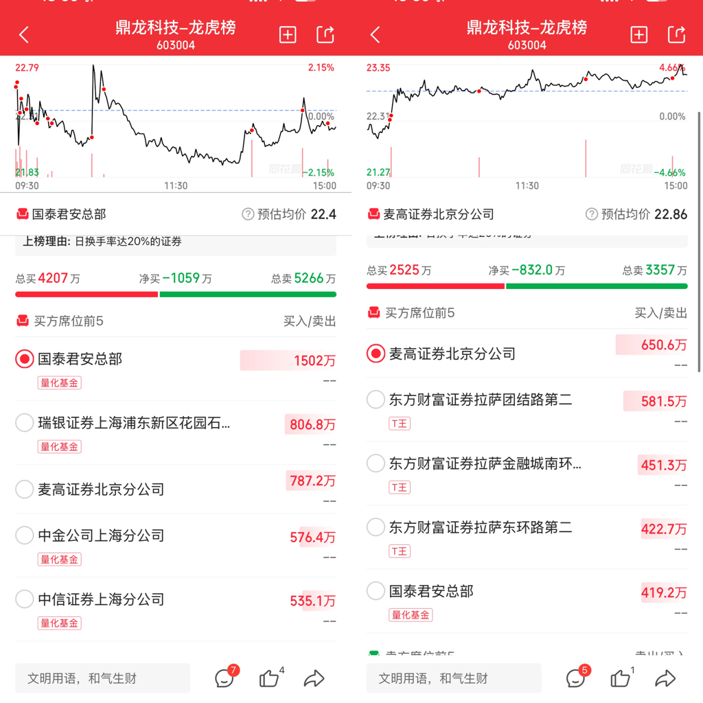 $鼎龙科技(SH603004)$ 两天龙虎都是30%换手上的,其实今天和前天没啥区别都是表现出没有柚子参与,今天的棒少了量化大额买卖所以显示出散户多,实际上前天散户也不少的,两天的榜单金额占比总成交都不大,筹码依旧分散,只不过都没被套牢所以情绪稍微好一点.
