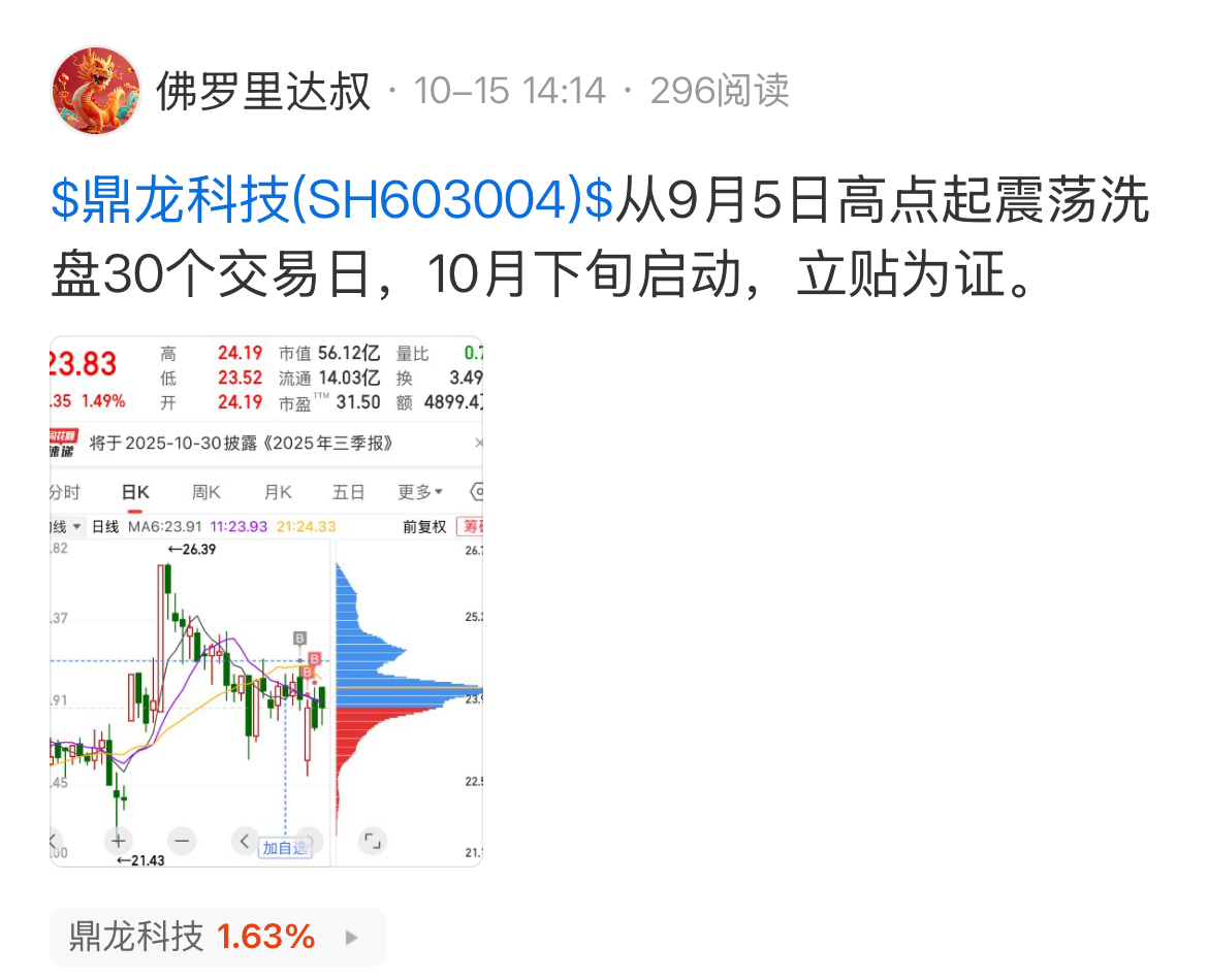 $鼎龙科技(SH603004)$ 2025年10月15日的判断,耐心持有静待花开。