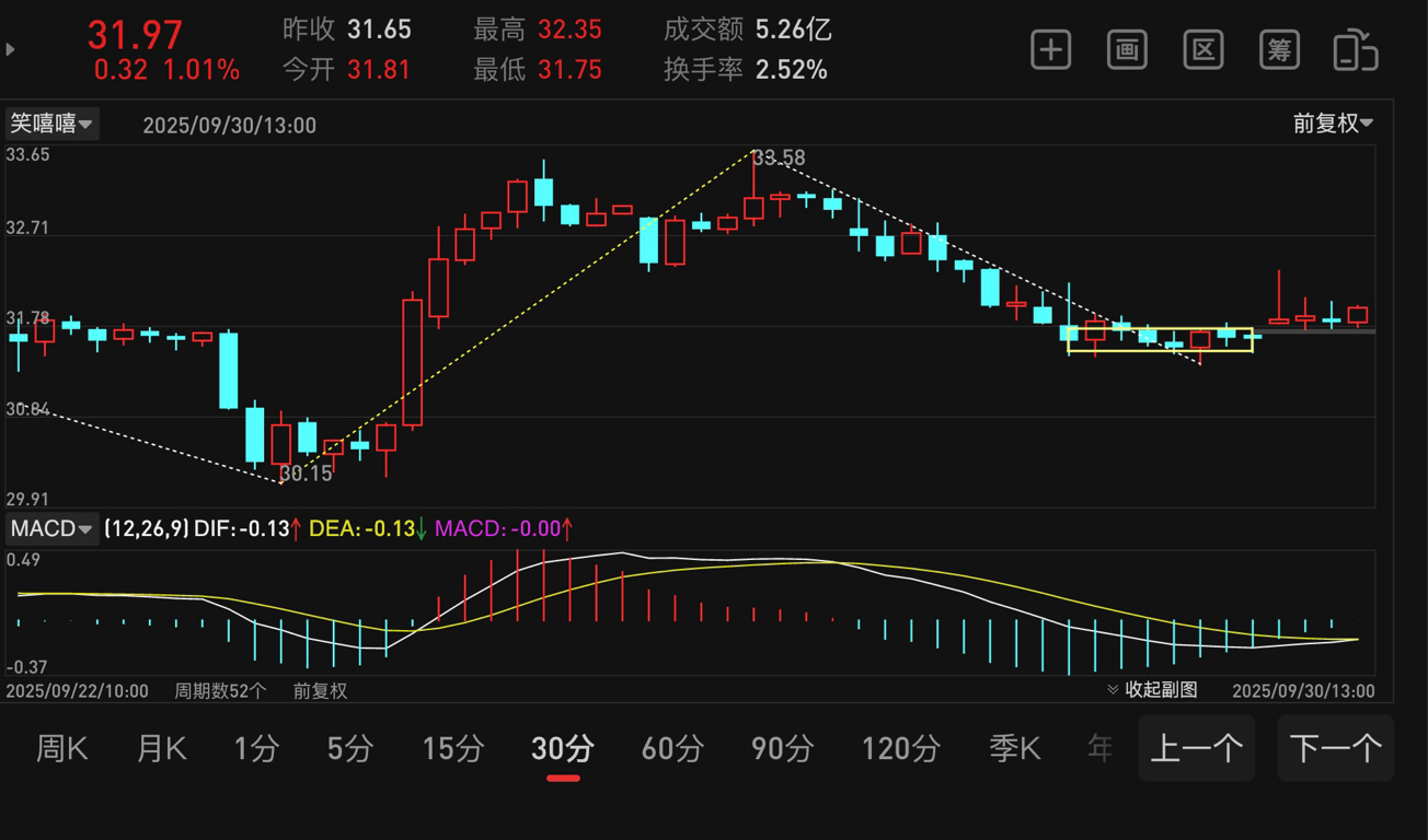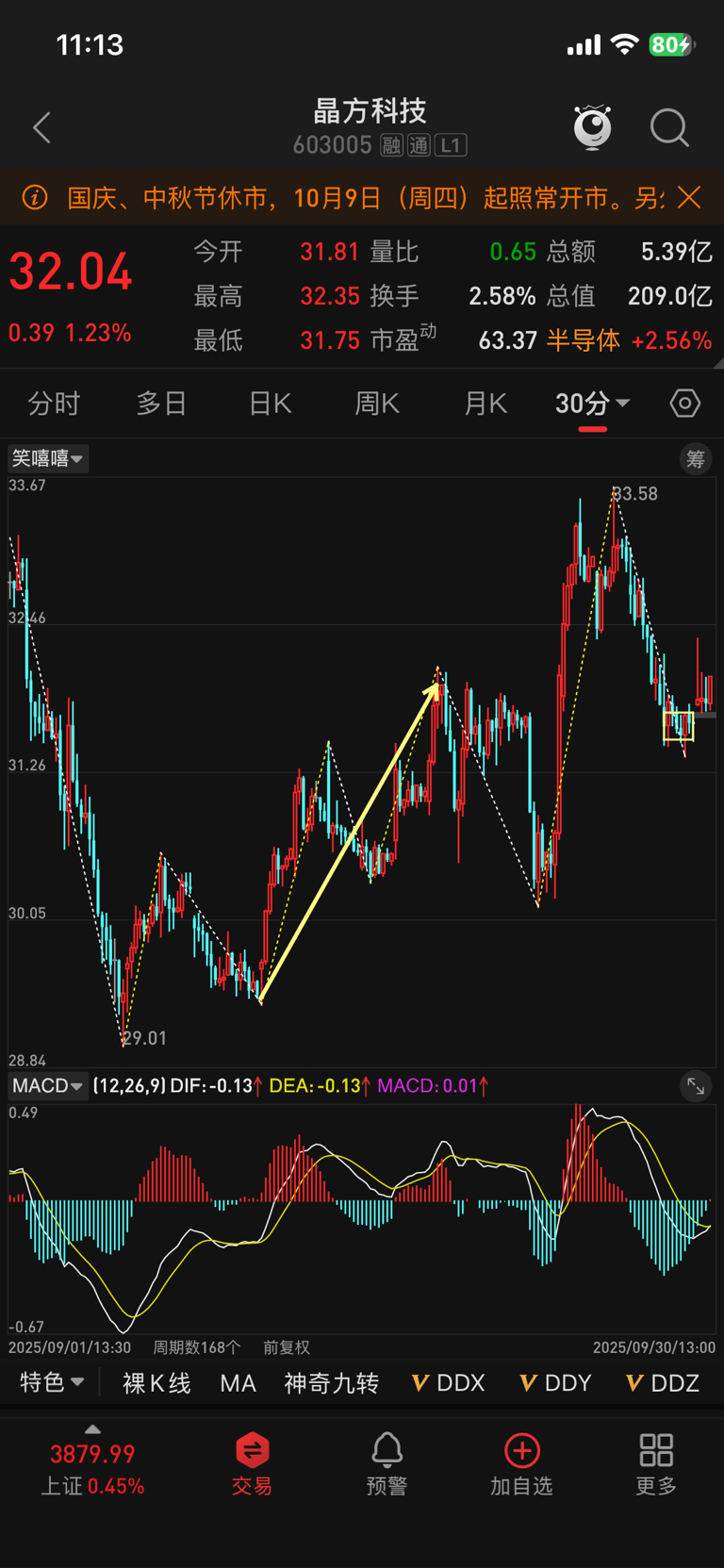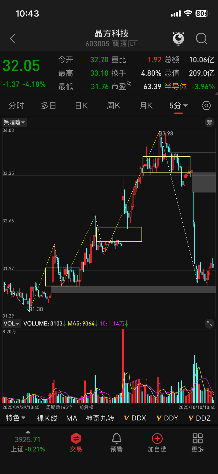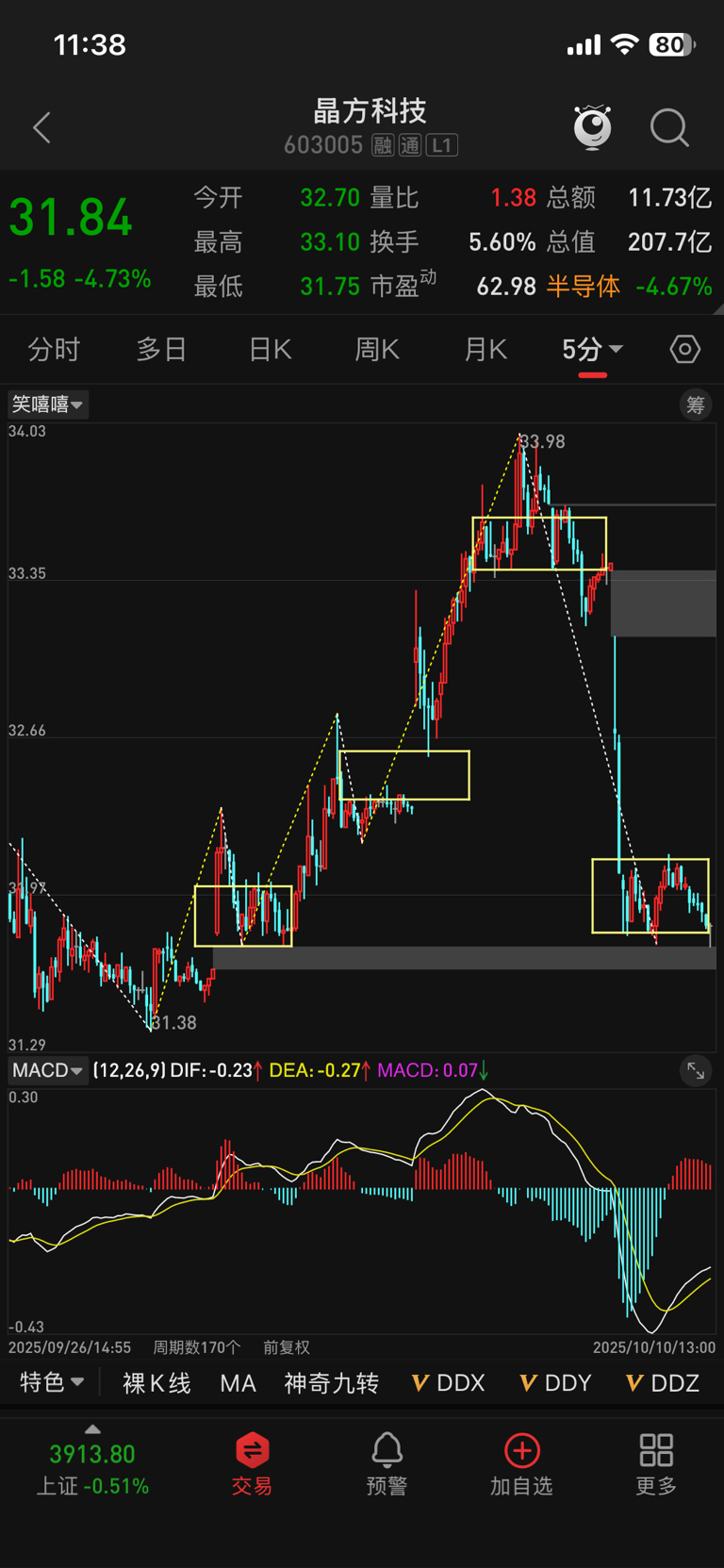$晶方科技(SH603005)$ 晶方科技日线9月4日-25日B浪反弹走了五个子浪,当下价位是在摆脱30分周期的小方块起点,以跳空缺口为脱离的起点,上午分时回调迟迟未破,下午能够高看一眼,今天应以此缺口为防守止损的点位