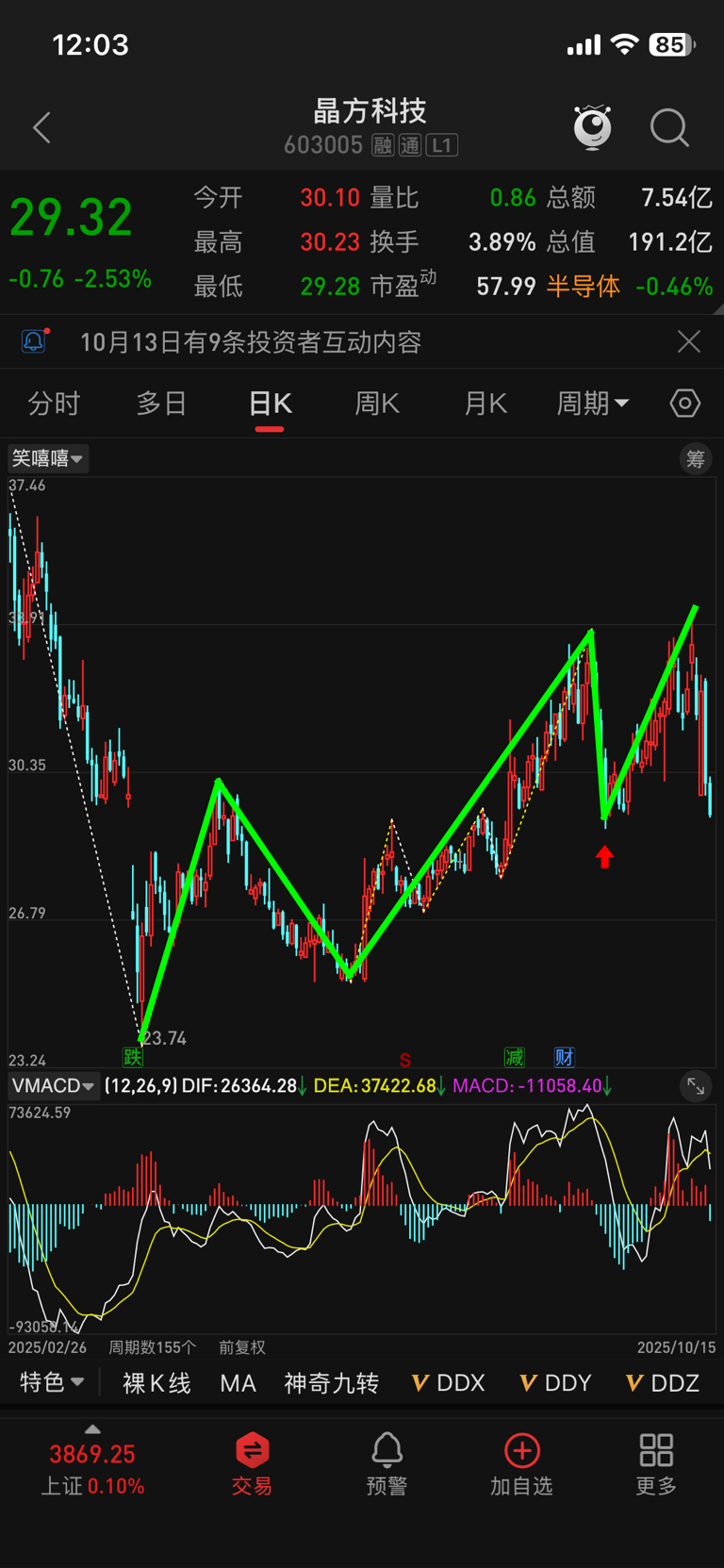 $晶方科技(SH603005)$ 在五浪结构后想洗出获利筹码的方法之一就是跌破红箭头的起点价格为29.01,此时持筹者才会有趋势转变的心理暗示。而250日的平均成本为29.2,且13/14日的k线多空力量都已经有了较大释放,因此价格在跌破29.01后,是可以期待一个比较大的反弹,因此是买点。