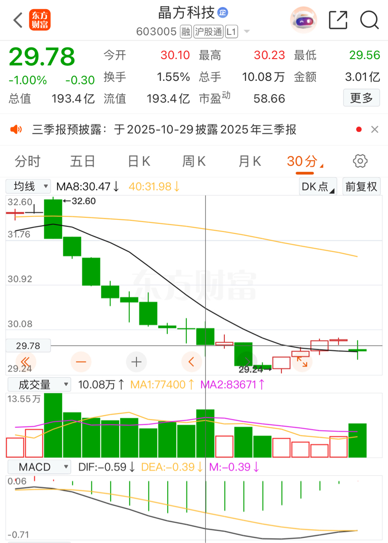 $晶方科技(SH603005)$ 昨天早盘30分钟放量10万手向下,今天早盘7万多手,缩量在观察半小时,看29.8还有希望吗