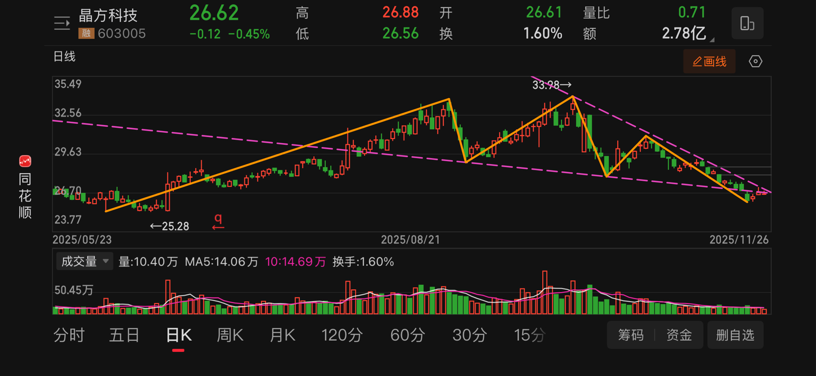 $晶方科技(SH603005)$ 三重顶颈线跌破后的缩量回抽,若突破三角形上方趋势线则为买点,等待方向选择。