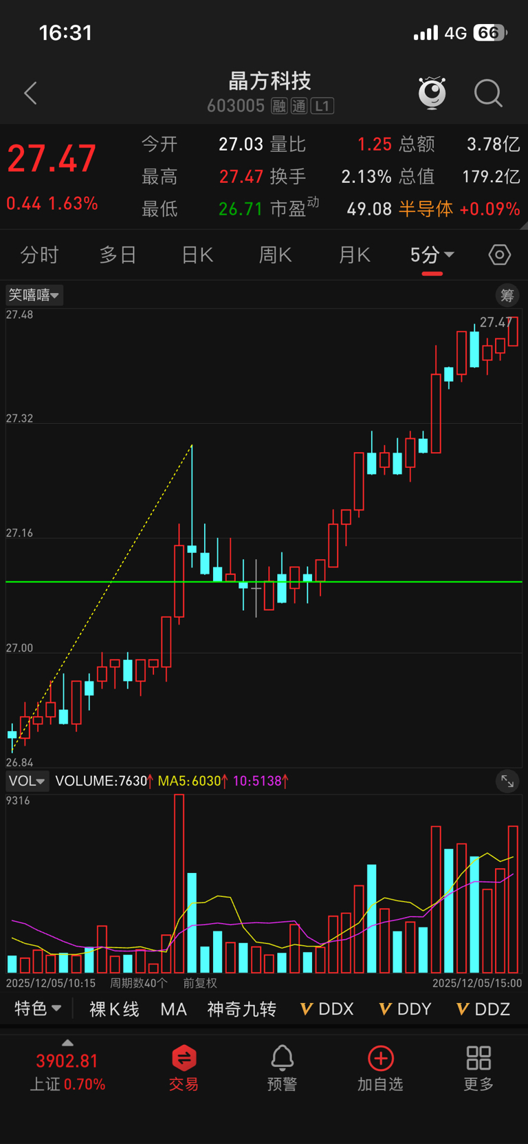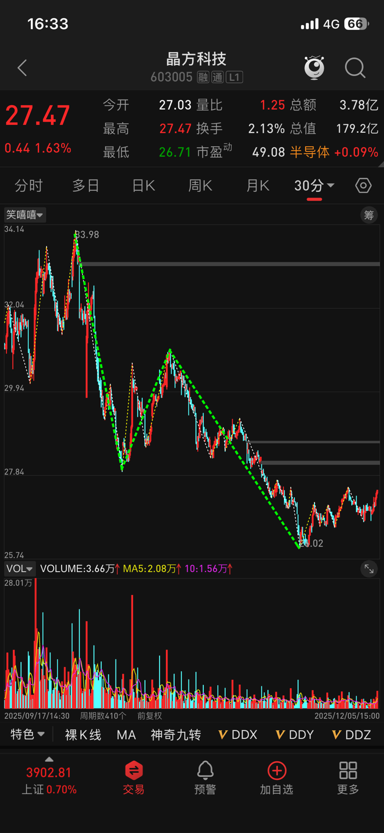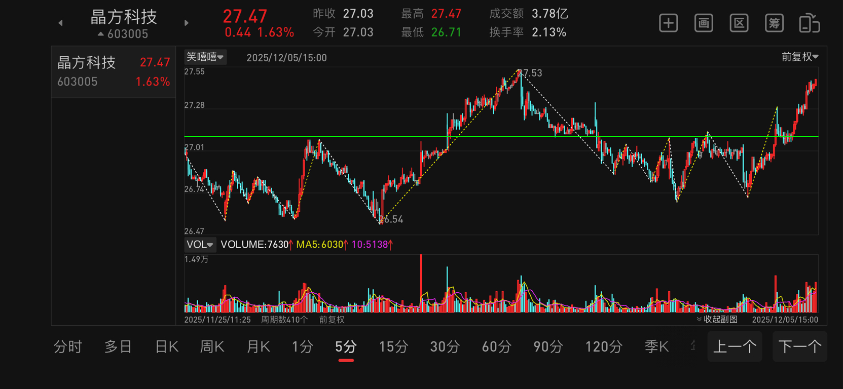 $晶方科技(SH603005)$ 上午收盘前突破绿线,下午开盘后在此线横盘四十分钟而不跌下去后一路向上了,这能够看作为主力语言,所以后续应该以27.08做为止盈线。因为一旦再跌破,就很难在拉上来了。而在30分钟级别,第四浪的反弹尚未触及a浪终点27.94且11月14日的缺口也在此价位,综上压力位为28.1附近,而止损应放在27.08。
