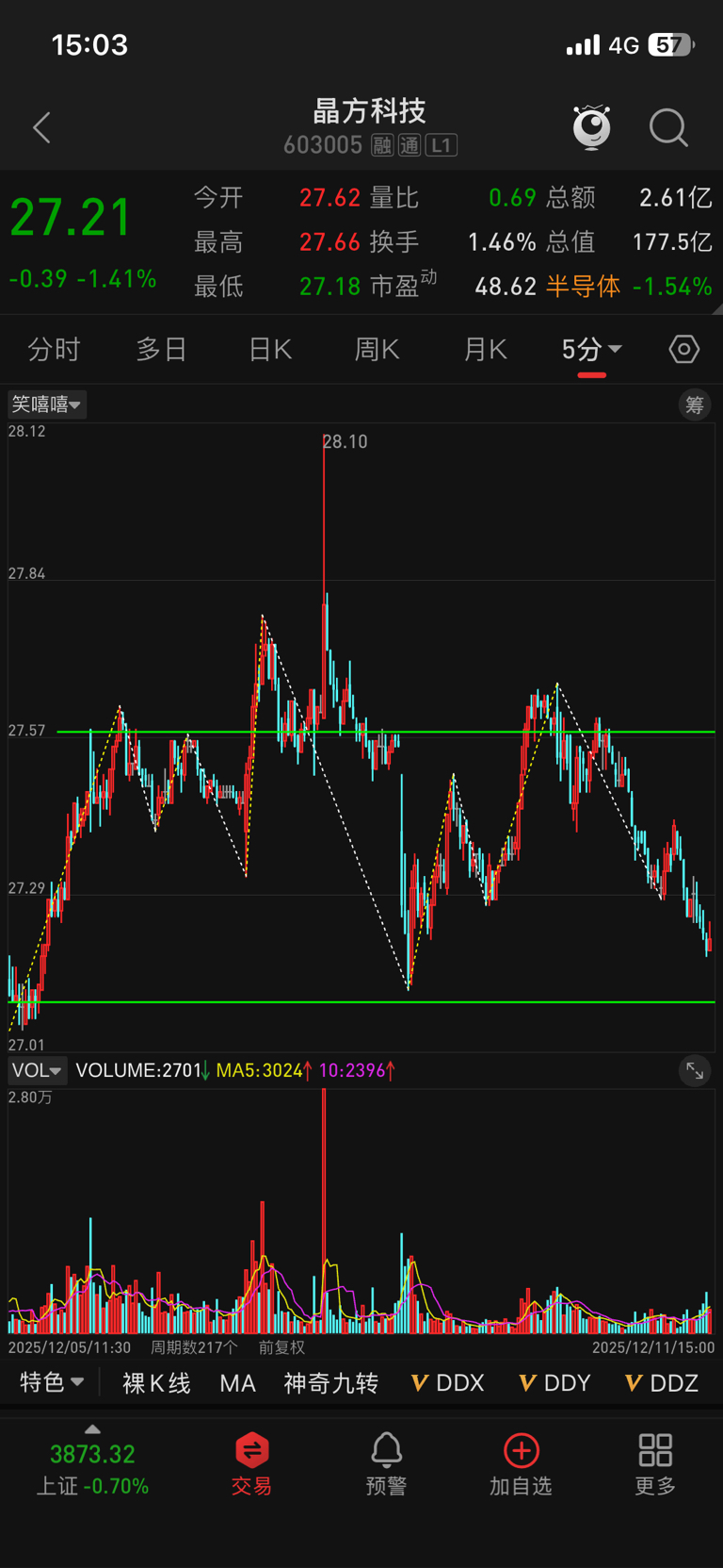 $晶方科技(SH603005)$ 开盘就跌破,10:40回抽还骗一下,全天无买点,有资金了没入场点。继续等吧。