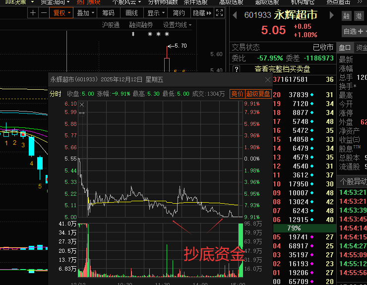 永辉的逻辑很简单,消费+福建板块,波哥周五就看到永辉超市反核的机会,因为跌停板上一直有资金吸筹,所以早上看到东百集团强势后波哥毫不犹豫低吸上车,但是5.3这里有一点压力,不排除主力明天再洗一下。