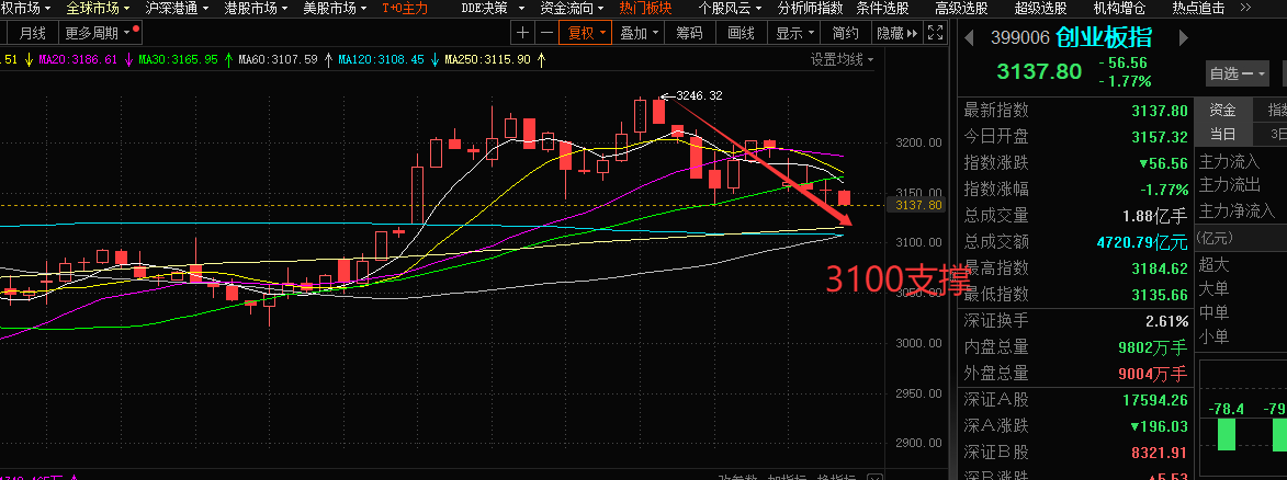 今天的盘面有点弱,波哥也没想到从上周五百家欢喜到群体落泪仅仅只是隔了个周末,虽然周六早上看到M股收盘知道会低开一下,但确实没想到低开之后越走越弱,下午连个反弹也没有,情绪大幅回落,沪深两市成交总额为17734亿元,较上周五缩量3189亿元。目前指数在技术面走势上处于60分钟调整末端,给大家分解下创业板指数的结构走势,注意60分钟年线的支撑。