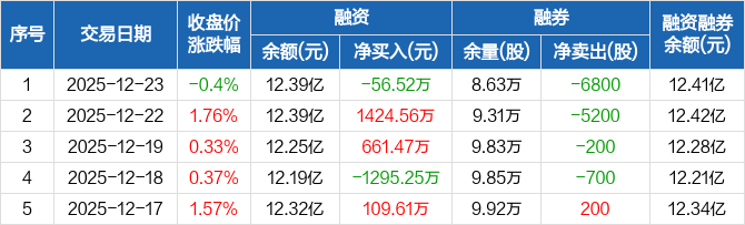 晶方科技:融资净偿还56.52万元,融资余额12.39亿元(12-23)