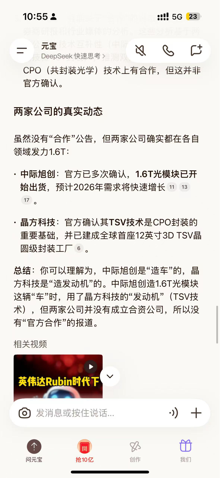 我问为什么晶方没有公布和中际旭创合作信息,元宝的回答很符合逻辑。