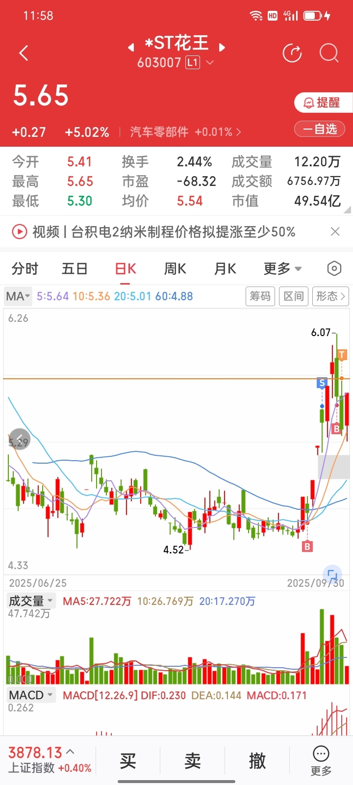 $*ST花王(SH603007)$ 上次挣了三板,做丅卖飞了,今天T都不敢做,怕卖飞了。