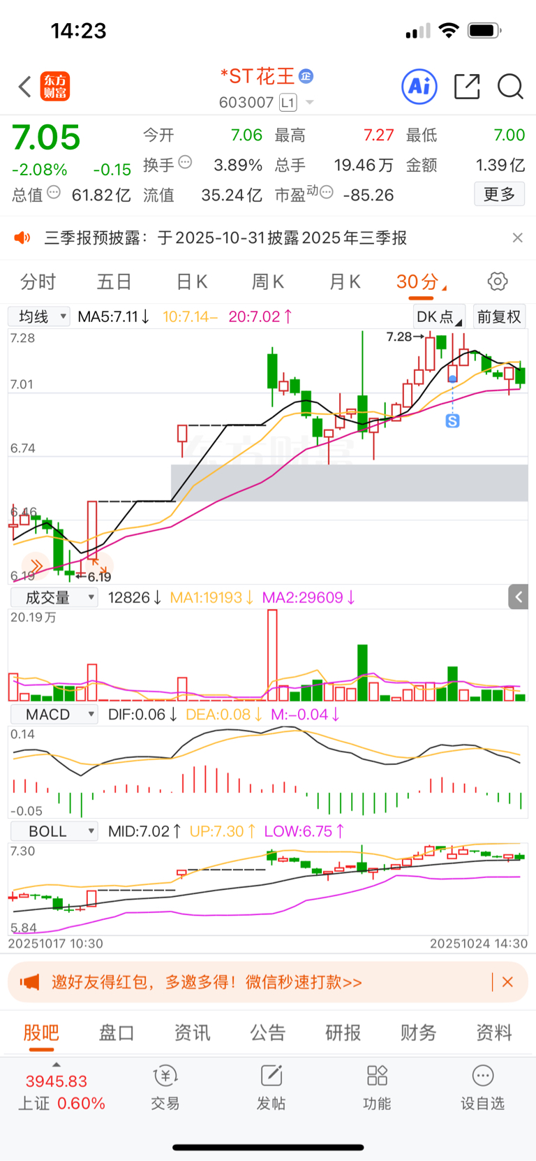 $*ST花王(SH603007)$ 先出来了,没卖在分时高点,看集合竞价低开,早早挂单就跑了,等下次机会了。感谢花哥,今年做了两波都获利了结。
