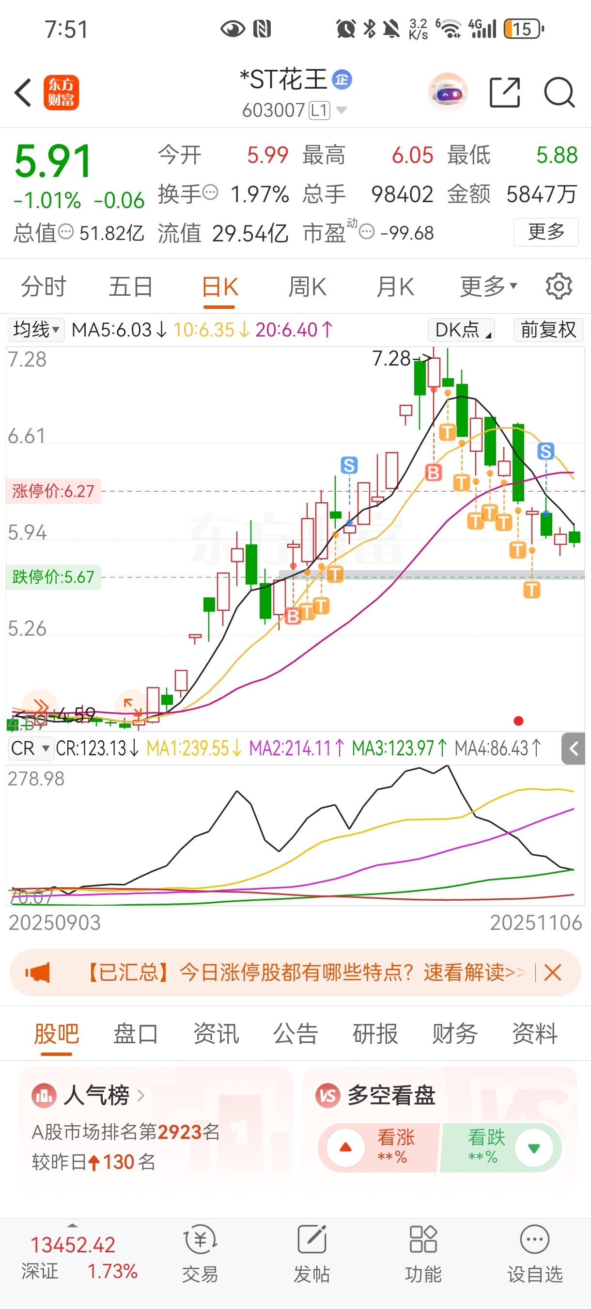 $*ST花王(SH603007)$ 可能会跌到5.26的位置再反弹