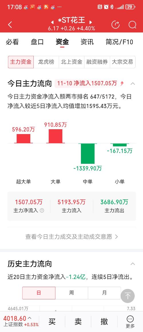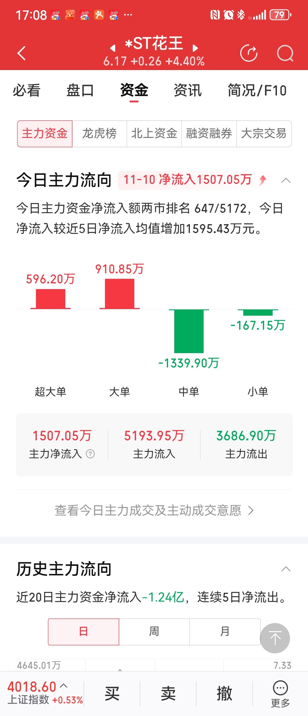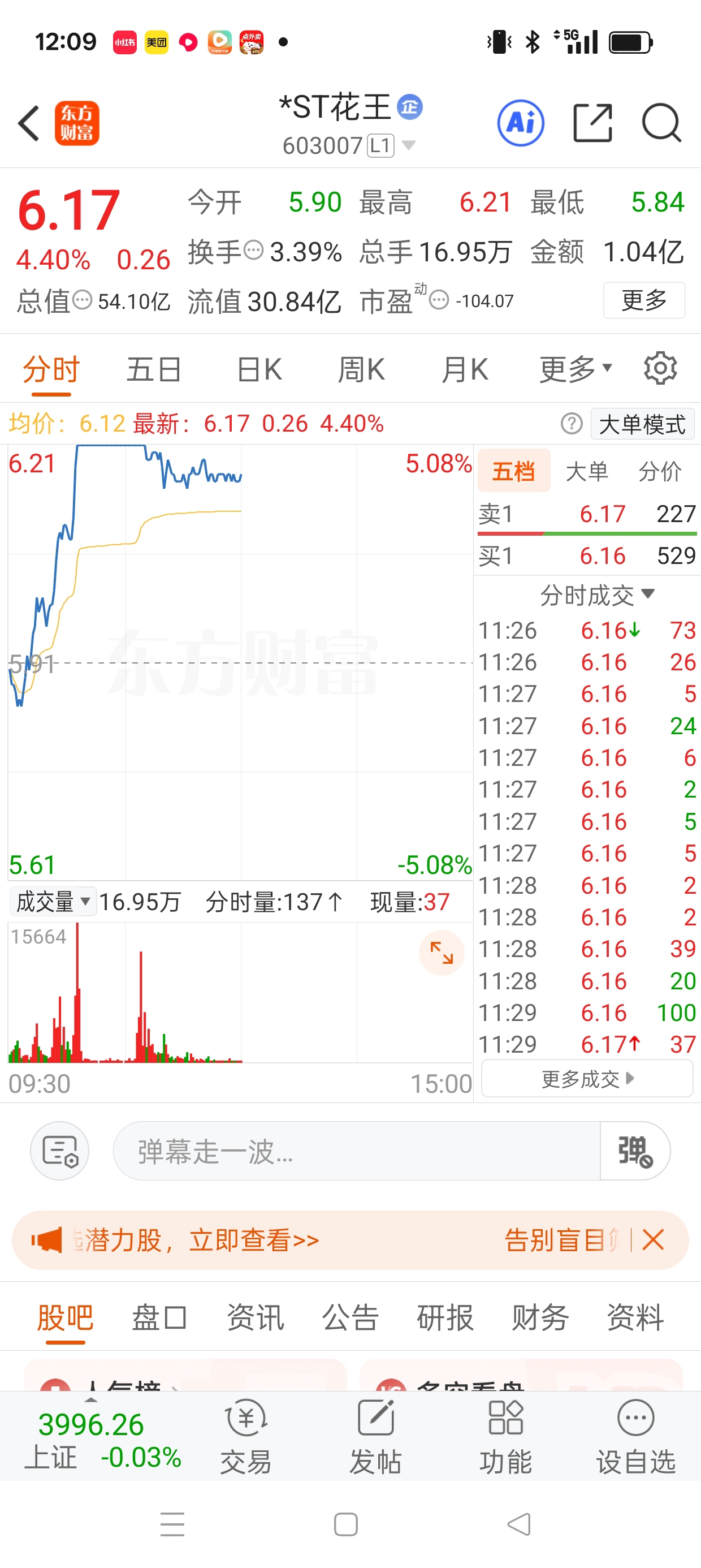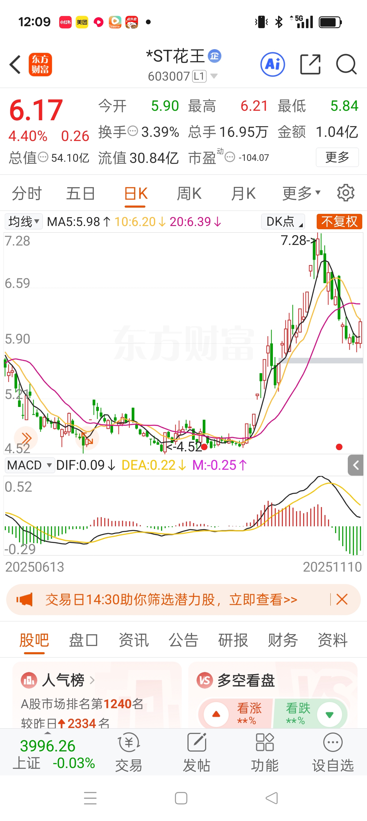 $*ST花王(SH603007)$ 个人观点,做个思考的记录吧!早上直接拉升到涨停,散户是不可能做到这一点,应该只能是主力行为!主力这么干,只有三个目的,要么就是拉升股价,要么就是洗盘,要么就是出货!由于整个股价日线在下降趋势,主力在下降趋势中拉升股价可能性不大;若主力为了洗盘,洗盘是为了提高散户成本和收集筹码,前者可能性有,后者可能性不大;盘中在10:40开板,那一定也是主力的抛盘砸开,也就是说主力在这里对倒!对倒的目的是什么?大概率为了出货吧!接下来两天再观察一下!