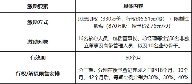 根据公告,本次激励计划采用股票期权与限制性股票相结合的模式,拟授予权益总计1200万份/股,约占公司当前总股本的1.37%。其中股票期权330万份,行权价格定为5.51元/股;限制性股票870万股,授予价格2.76元/股,后者约为期权行权价的50%。