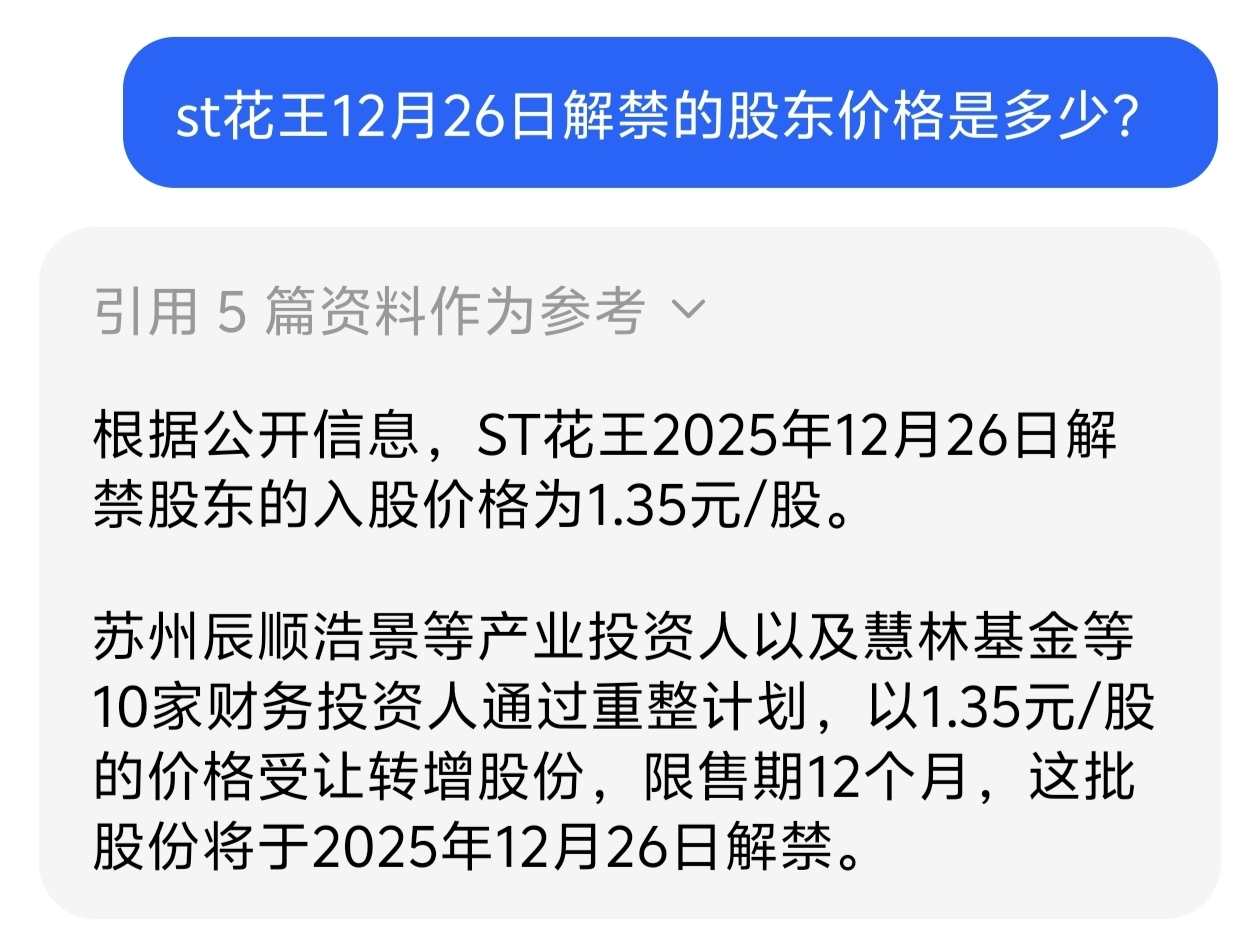 2.14亿股解禁,也就是214万手,成本才1.35。目前花王5块算,也赚4倍多。