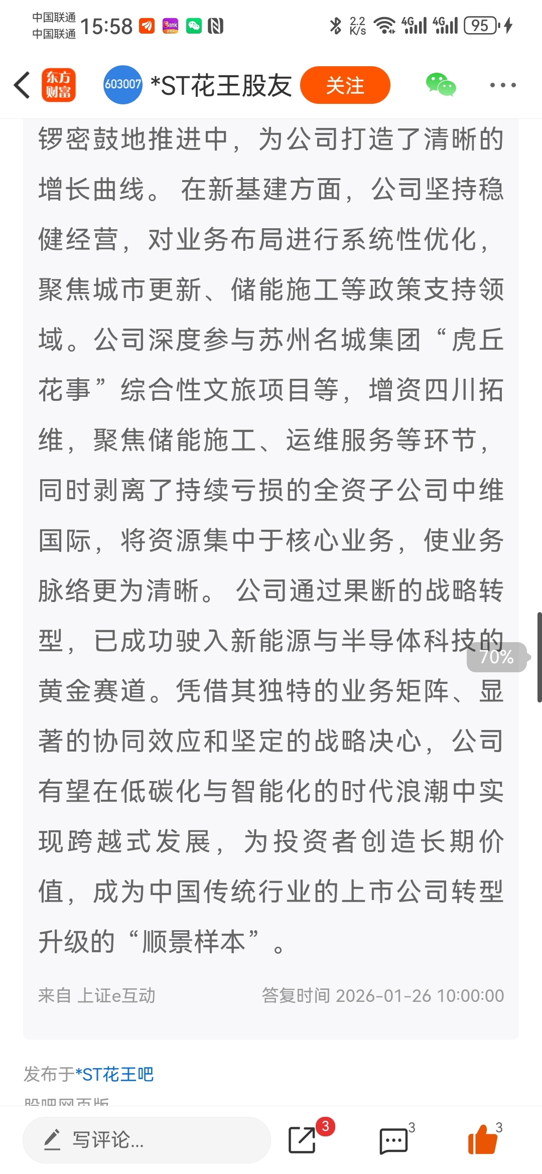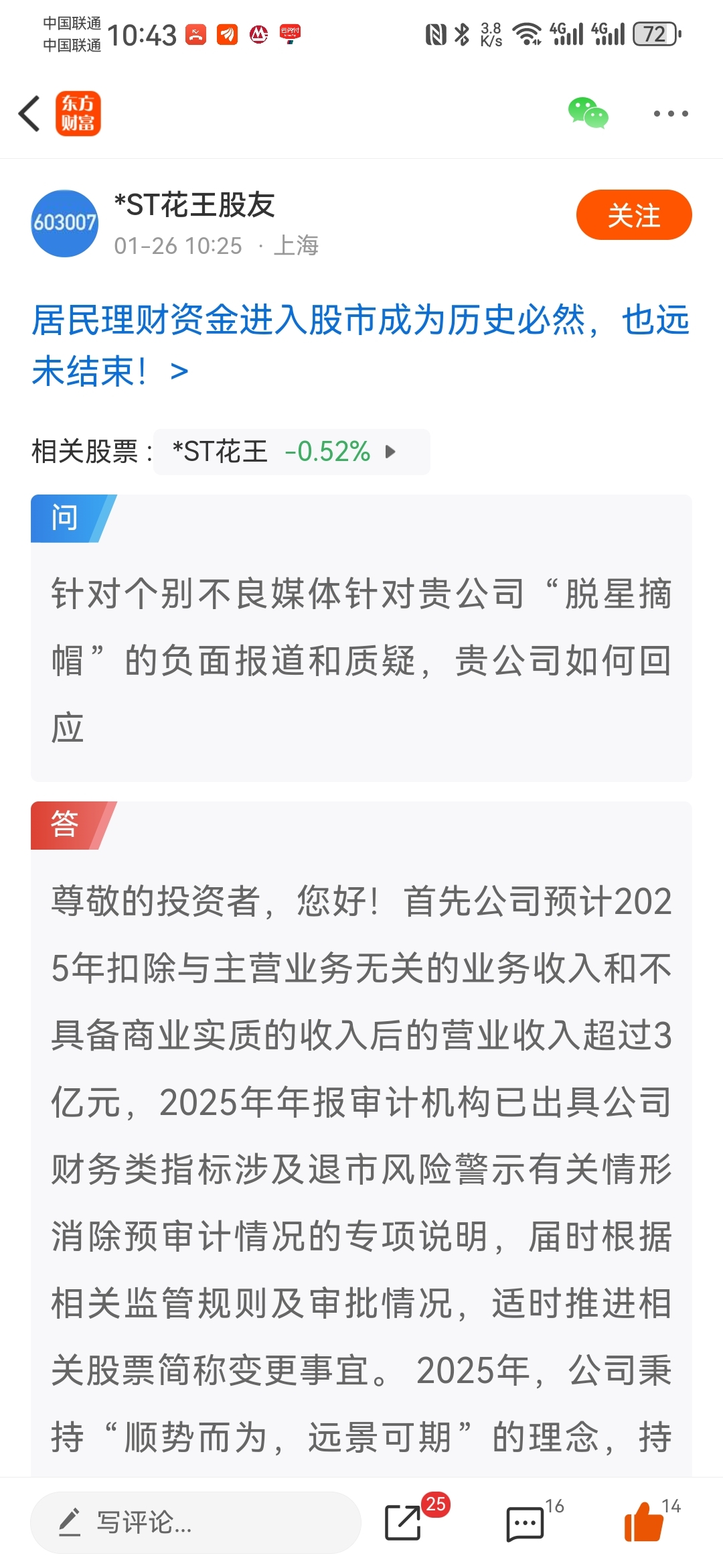 $*ST花王(SH603007)$ $*ST中基(SZ000972)$ 相对于中基推迟到4月初,花王的年报估计是年前最后一天,估计审计不配合,年后一般审计元宵节才陆续上班,延迟到3.6不算太晚。