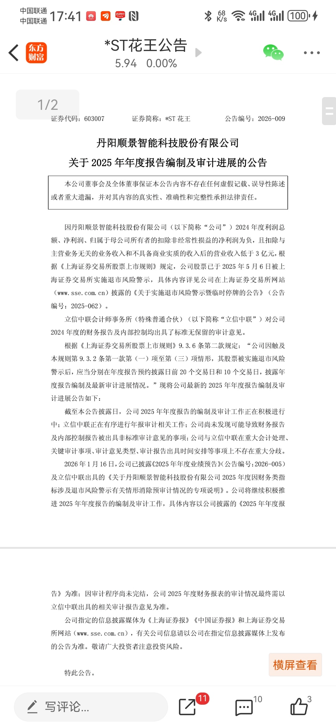 $*ST花王(SH603007)$ $*ST中基(SZ000972)$ $*ST汇科(SZ300561)$ 审计进展提前了2个交易日公布,说明大概率是审计负责签字的几个要放假回家,年后一般元宵节后回来,牛哥刚咨询了几个审计的朋友,一般过年都提前订票回,人家不肯在年报签字你就发不出去,这就解释了第二次审计进展提前且最早公告,反而年报却延后!还好延后不多,给了大家有机会以拍卖价抢筹码的机会!