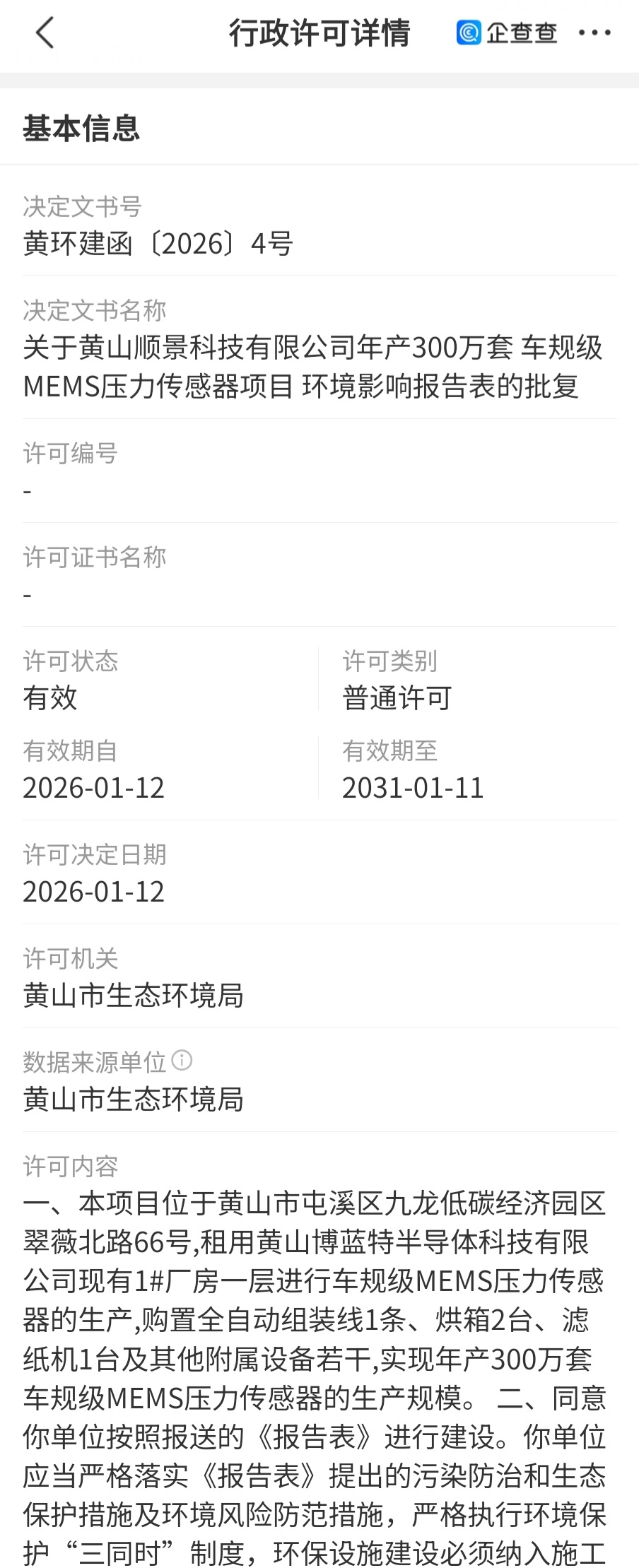 “租用黄山博蓝特半导体科技有限公司现有1#厂房一层进行车规级MEMS压力传感器的生产,购置全自动组装线1条、烘箱2台、滤纸机1台及其他附属设备若干,实现年产300万套车规级MEMS压力传感器的生产规模。”