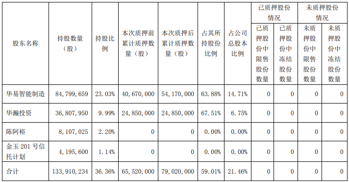 华易智能制造持有公司股份84,799,659股,占公司总股本的23.03%。本次股份质押后,华易智能制造累计被质押股份54,170,000股,占其所持股总数的63.88%,占公司总股本的14.71%。