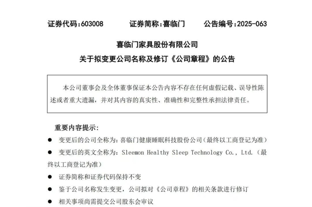 12月9日晚间,喜临门(603008)发布公告,公司董事会已审议通过《关于拟变更公司名称及修订〈公司章程〉的议案》,拟将中文名称由“喜临门家具股份有限公司”变更为“喜临门健康睡眠科技股份公司”,以更准确反映其战略定位与业务发展方向,揭示了中国睡眠产业正在经历一场深刻的变革。