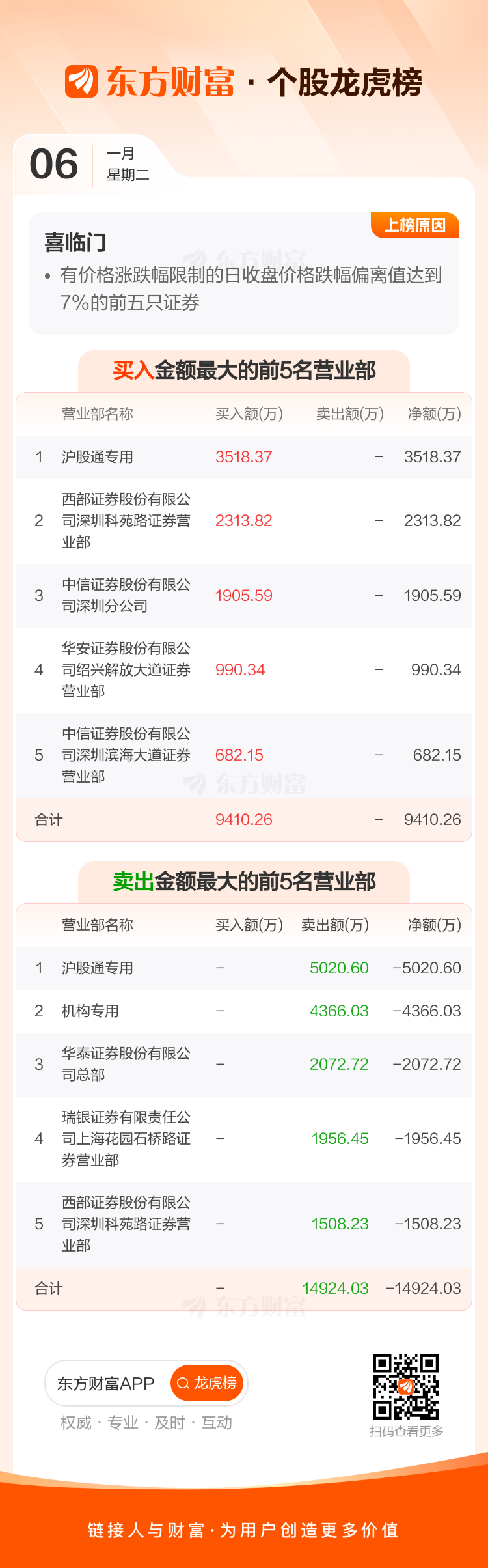 交易所2026年1月6日公布的交易公开信息显示,喜临门因成为有价格涨跌幅限制的日收盘价格跌幅偏离值达到7%的前五只证券上榜。喜临门当日收报21元,涨跌幅-5.96%,偏离值-7.45%,换手率9.24%,成交额7.19亿。