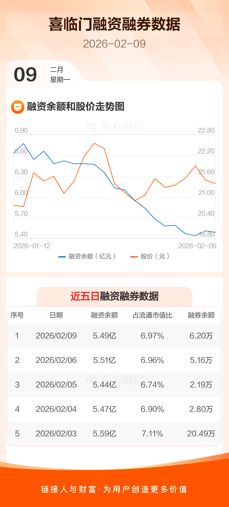 交易所最新数据显示,喜临门于2026年2月9日获融资买入1412.76万元,融资偿还1618.21万元,当日融资净偿还205.45万元。目前,该股融资余额5.49亿,占流通市值比例为6.97%。