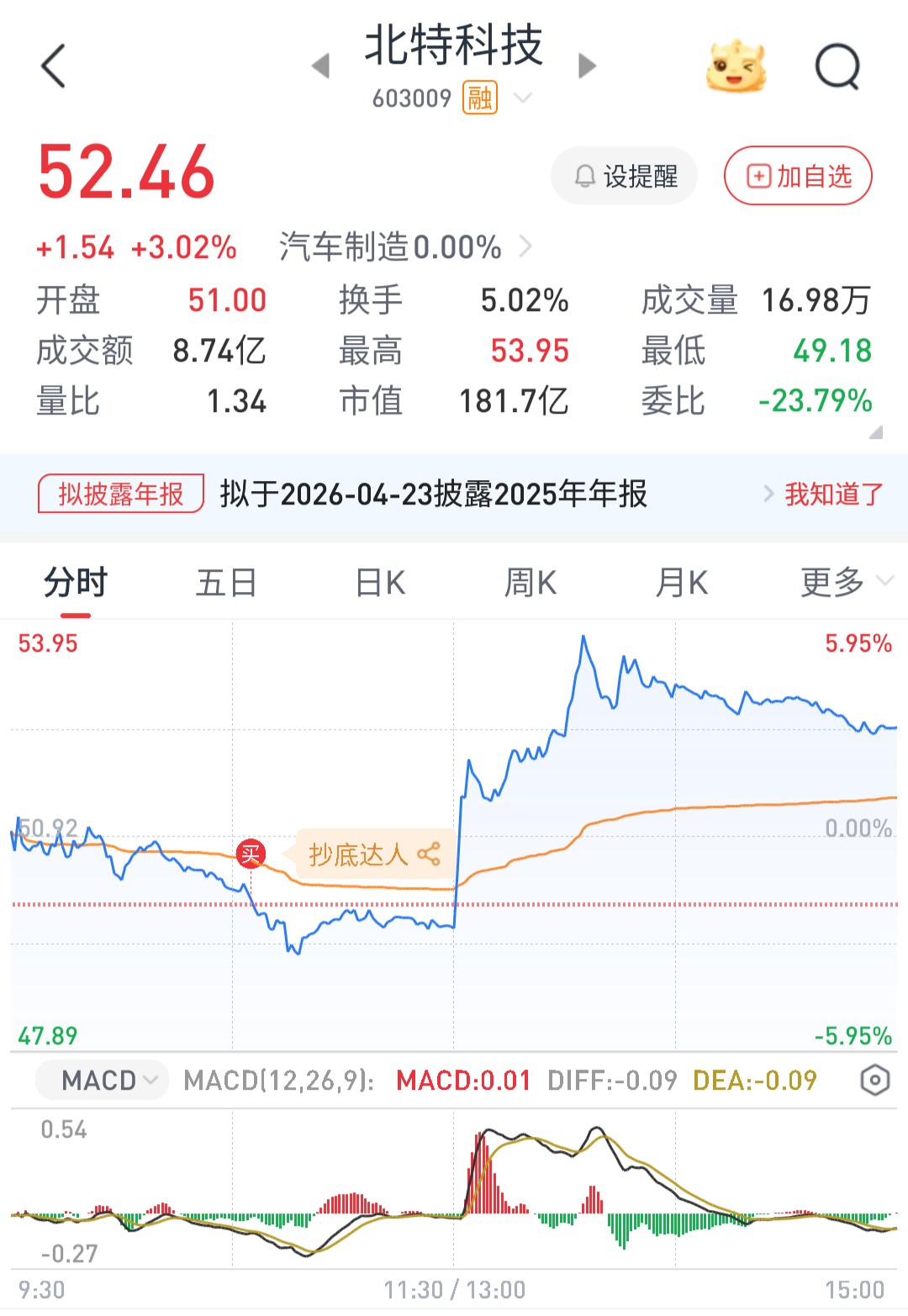$北特科技(SH603009)$ 49.75到49.15是北特的平台。。上沿抄到了。。可惜下沿49.15没抄到。。短线明天就撤。。