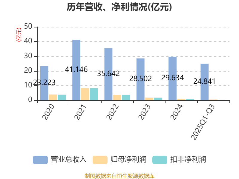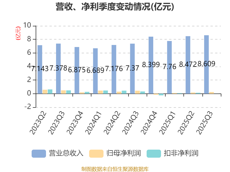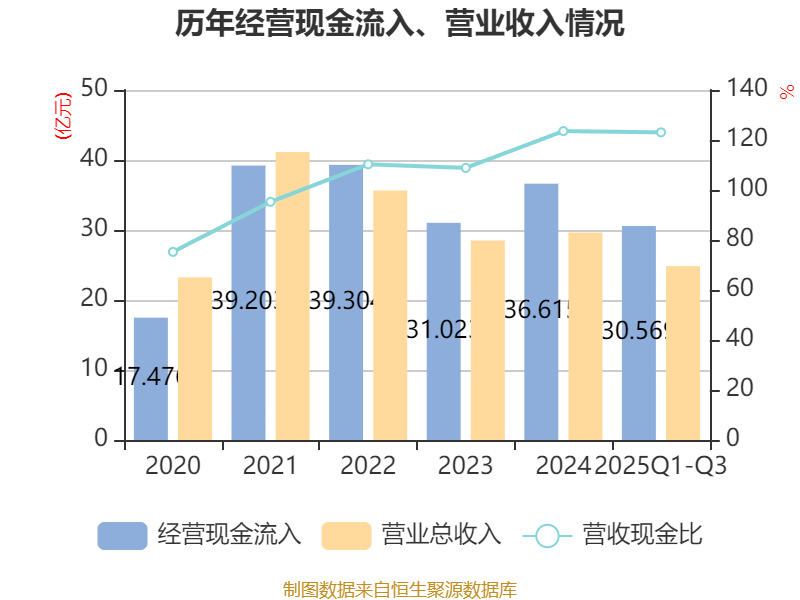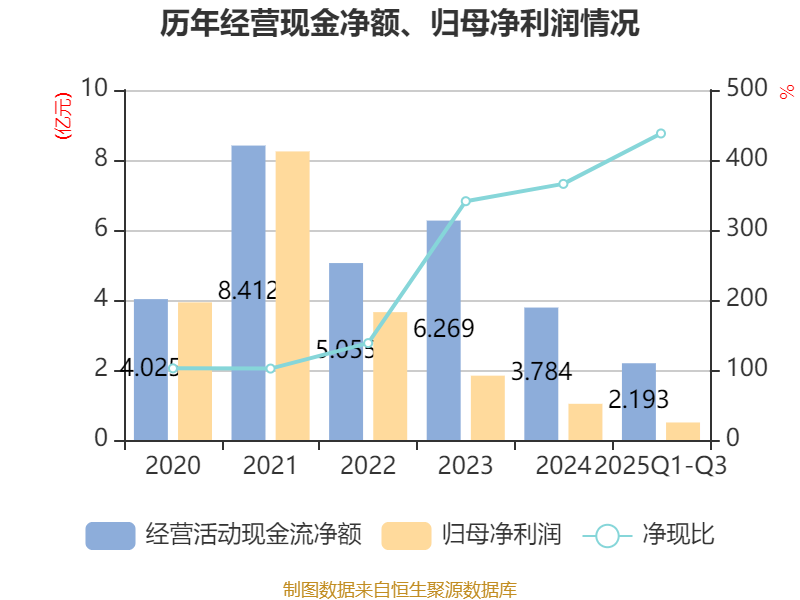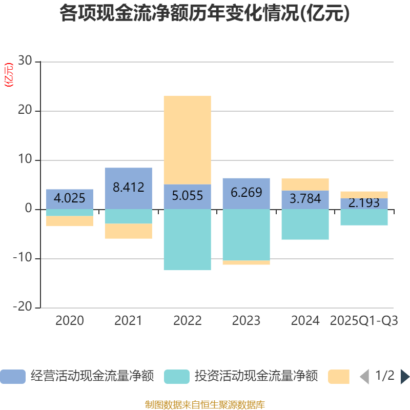 2025年前三季度,公司经营活动现金流净额为2.19亿元,同比下降11.23%;筹资活动现金流净额1.38亿元,同比减少1.6亿元;投资活动现金流净额-3.3亿元,上年同期为-3.77亿元。