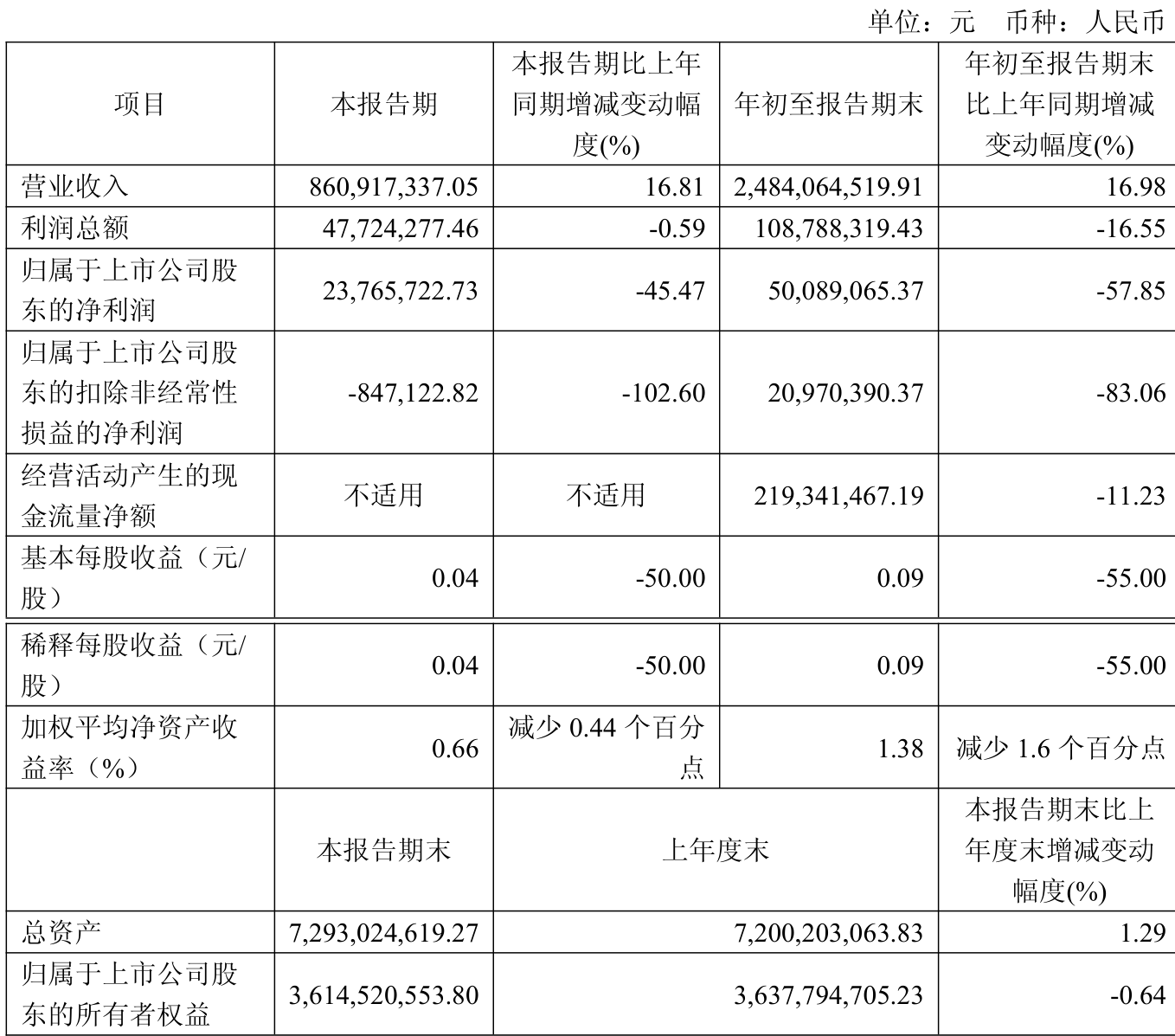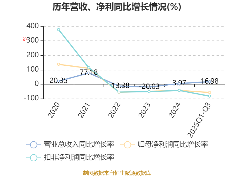 中证智能财讯万盛股份(603010)10月30日披露2025年第三季度报告。前三季度公司实现营业总收入24.84亿元,同比增长16.98%;归母净利润5008.91万元,同比下降57.85%;扣非净利润2097.04万元,同比下降83.06%;经营活动产生的现金流量净额为2.19亿元,同比下降11.23%;报告期内,万盛股份基本每股收益为0.09元,加权平均净资产收益率为1.38%。