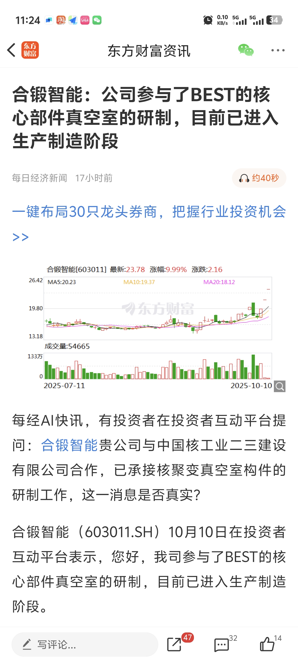 【合锻智能】10.11号最新消息1.内部人士向新闻媒体爆料。《聚变真空室生产制造