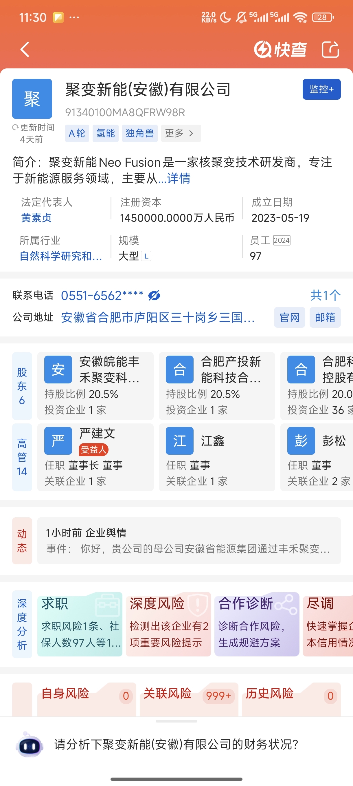 $合锻智能(SH603011)$ 聚变新能是合肥核聚变发起者,高管是严建文,合锻董事长,没收入,是还没交付,预计明年6月交付