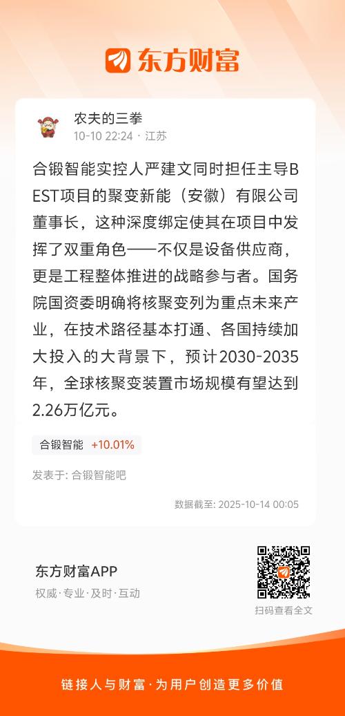 合锻智能实控人严建文同时担任主导BEST项目的聚变新能(安徽)有限公司董事长,这种深度绑定使其在项目中发挥了双重角色——不仅是设备供应商,更是工程整体推进的战略参与者。国务院国资委明确将核聚变列为重点未来产业,在技术路径基本打通、各国持续加大投入的大背景下,预计2030-2035年,全球核聚变装置市场规模有望达到2.26万亿元。