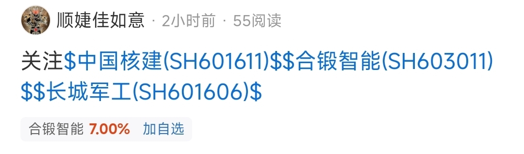 $合锻智能(SH603011)$ $长城军工(SH601606)$ $中国核建(SH601611)$ 昨天跟今天都让你们关注的三支都关注了吗?都是大涨,有些朋友昨天就关注上车了的直接吃了十几个点。