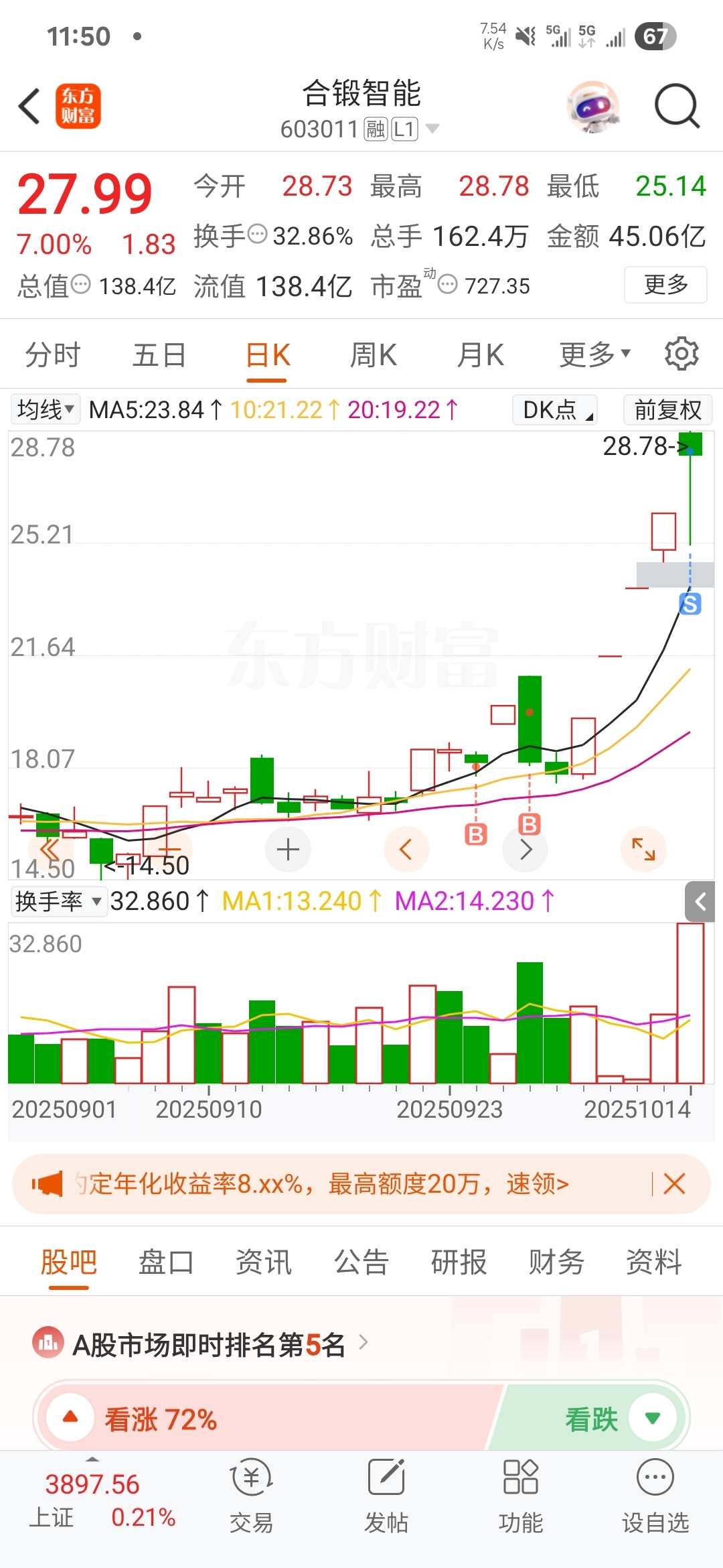 谢谢合锻全仓吃了五十个点。希望你是洗盘,祝福你股价上100块。我就护航到这里了!