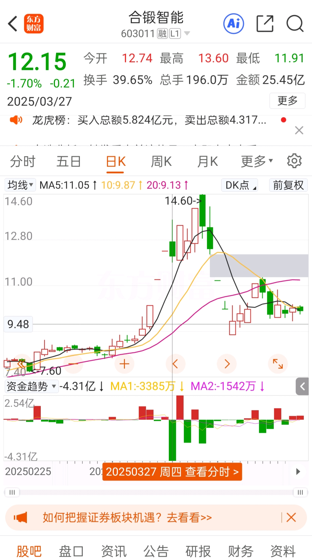 $合锻智能(SH603011)$ 请参考3月27号走势,今天充分换手洗获利不坚定筹码,明天继续接力涨停板,这波看到50。