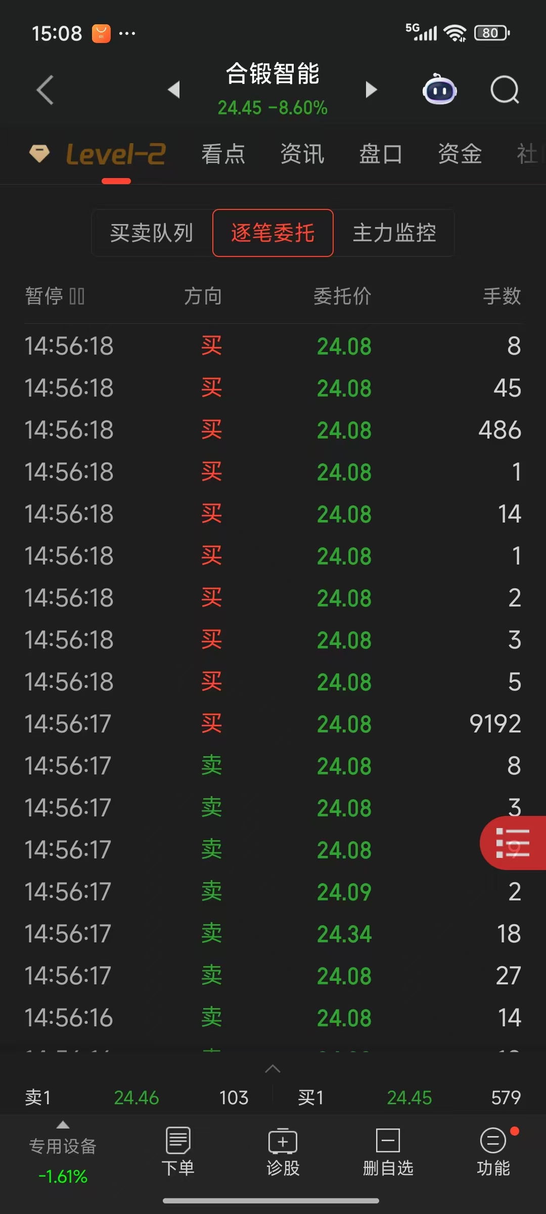 核聚变必有二波一一56分4万手有蹊跷,合锻智能我的软件明细里只有一个9192手的大单,还有3万手呢?