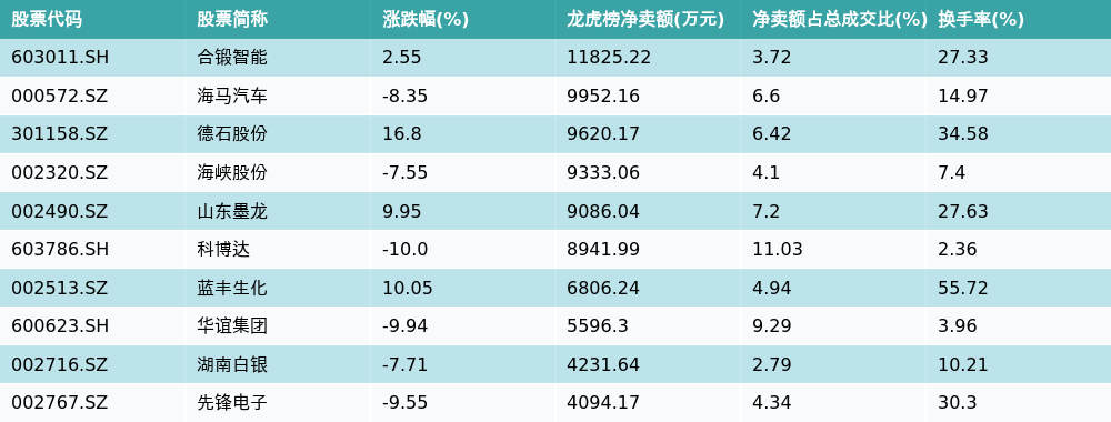 南财智讯10月22日电,南财金融终端数据显示,因当日异动登上龙虎榜的个股中,龙虎榜中资金净流出最多的前三位分别是合锻智能(603011.SH)、海马汽车(000572.SZ)与德石股份(301158.SZ)。其中排名第一的合锻智能被净卖出1.18亿元,占总成交金额的3.72%。合锻智能收盘上涨2.55%,换手率为27.33%。净卖出额前10个股详情见下图: